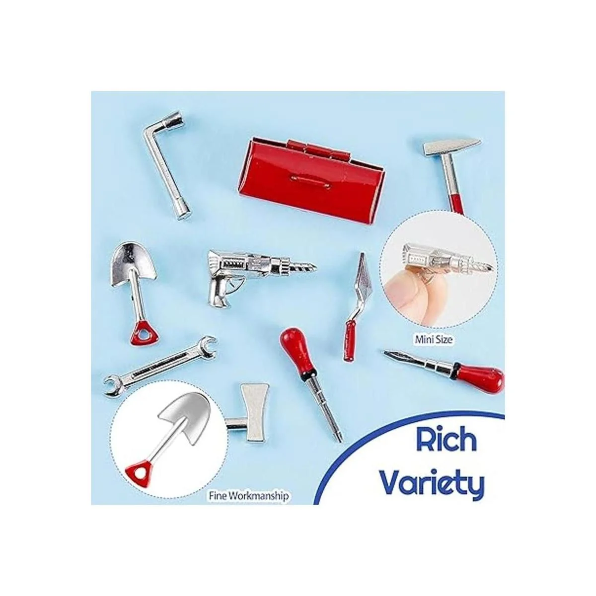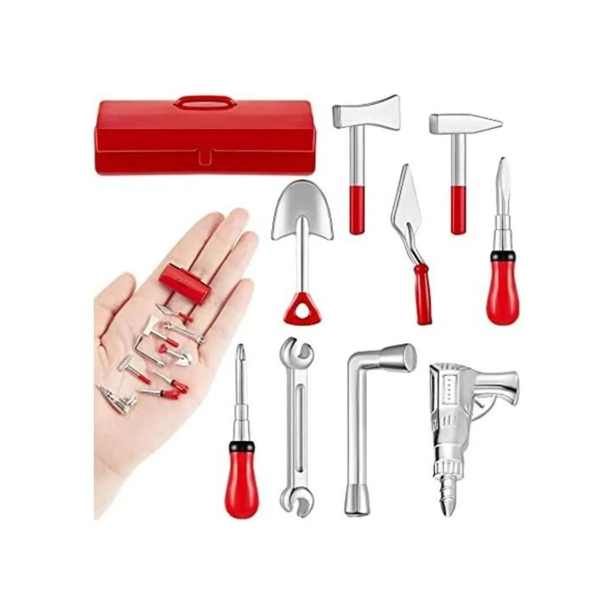 Juego de 10 herramientas para casa de muñecas, mini herramientas para reparación de casas de muñecas, incluye una caja de lata roja, 4 herramientas para exteriores y 5 herramientas de reparación, accesorios divertidos para decoración de casa de muñecas para fiestas
