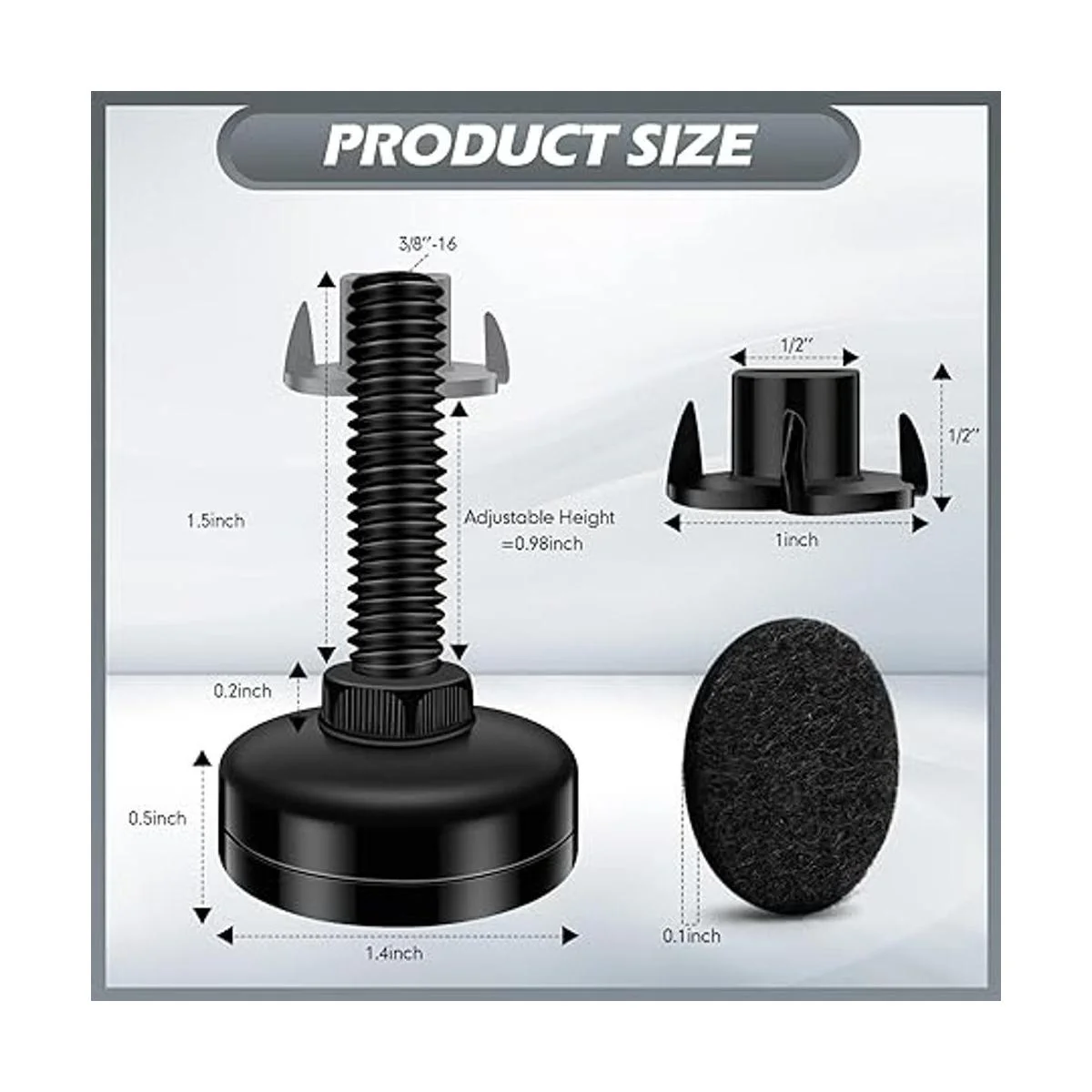 Flexibles ajustables: los pies niveladores ayudan a ajustar la altura de los muebles, inserto de acero de 1.75 pulgadas de largo con rosca de 3/8 a 16 pulgadas, el diámetro de la rosca es totalmente ajustable, proporciona un fuerte apoyo y ajuste para los muebles