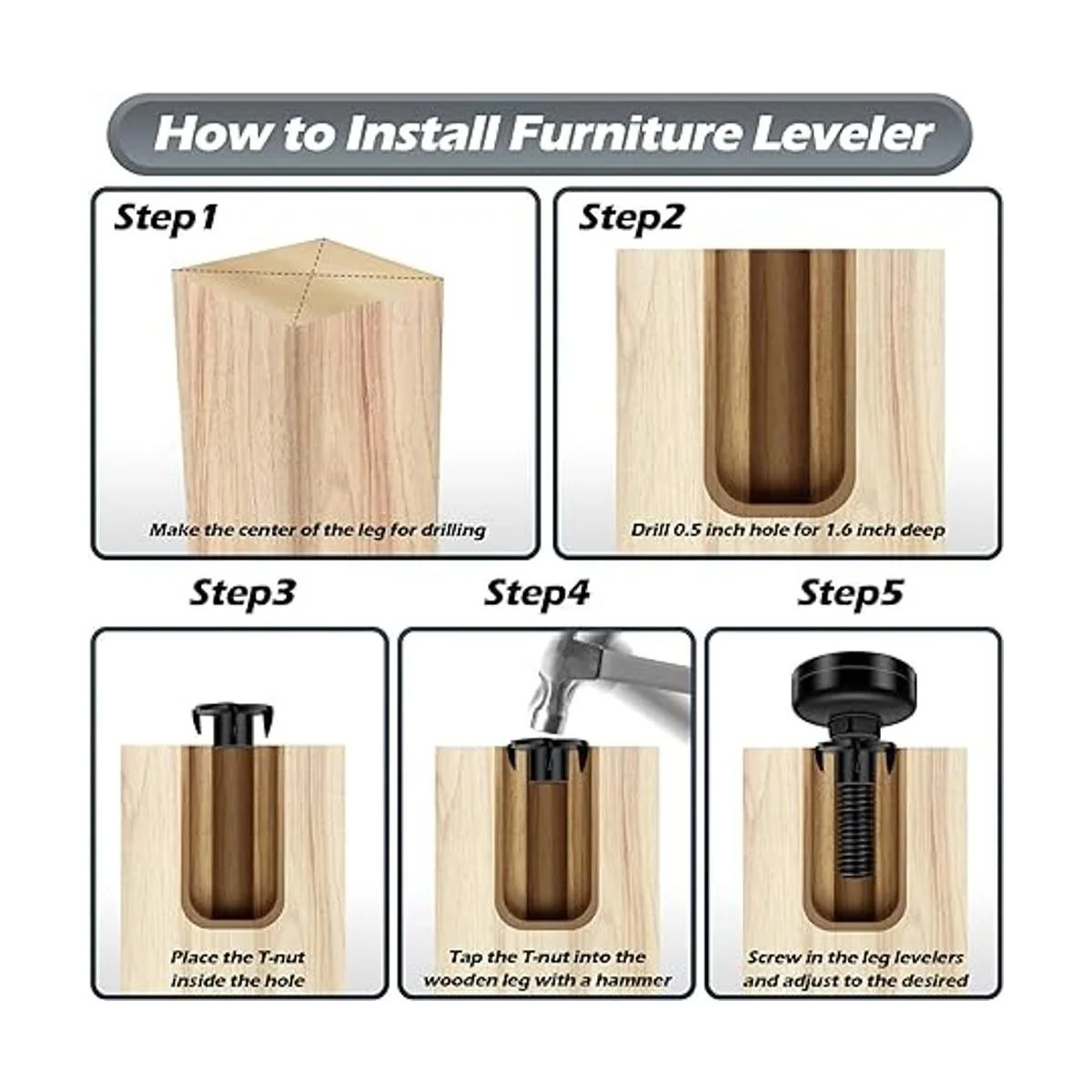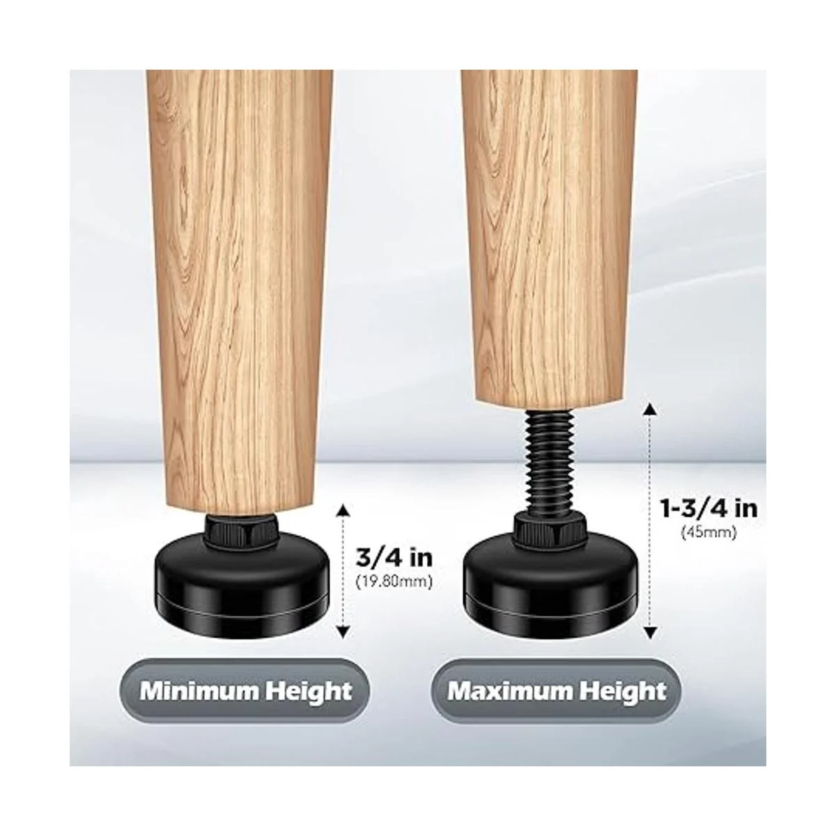 Fácil instalación: para patas de muebles existentes con rosca de 3/8 a 16, simplemente atornilla el alisador de patas para ajustar la altura. Alternativamente, taladra un agujero de 1/2 pulgadas con antelación e inserta la tuerca en T de instalación universal, atornilla el alisador de piernas y ajusta a la altura requerida