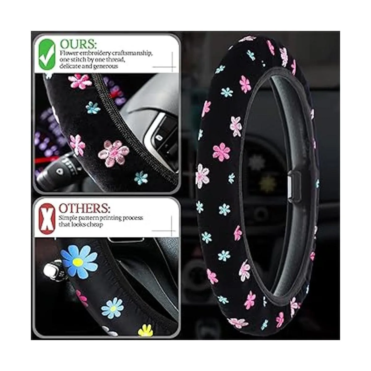Delicado diseño floral: el bonito juego de fundas para volante adopta una delicada mano de obra bordada con patrones florales coloridos, tiene una vida útil más larga que los impresos comunes, encantador y elegante; la bonita funda para volante puede añadir un estilo elegante a tu coche y estos clips de ventilación de flores pueden crear un ambiente fresco y romántico para tu coche