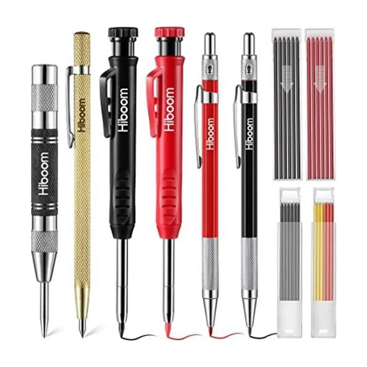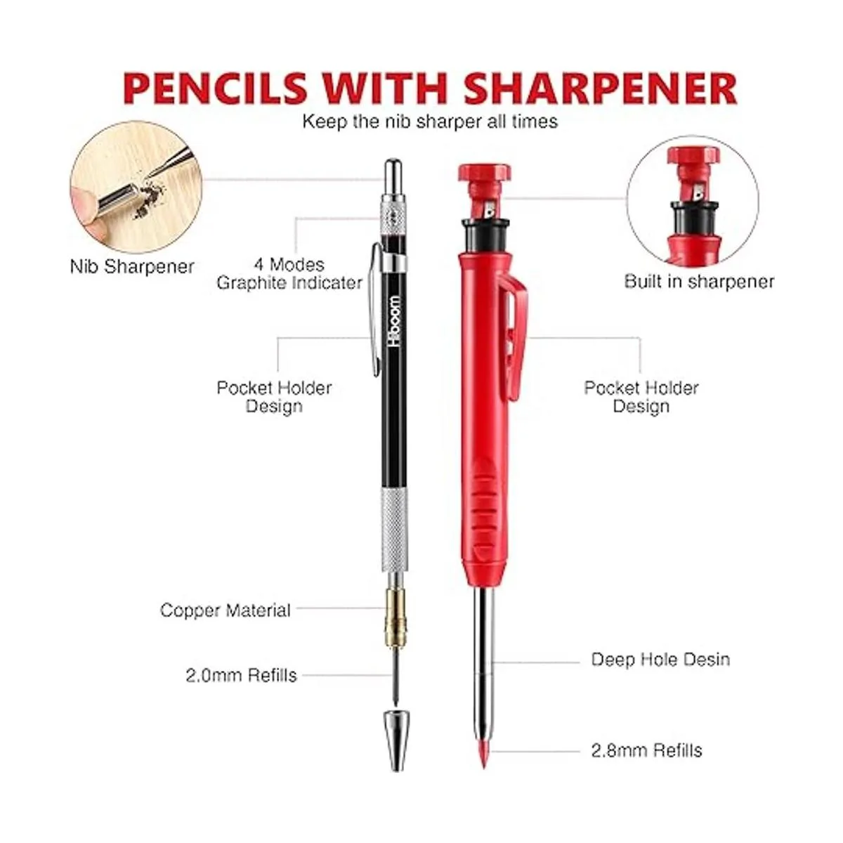 Lápices de carpintero integrados: los lápices de carpintería vienen con un sacapuntas integrado atornillado en la parte superior de cada lápiz para mayor comodidad; hay 4 lápices de carpintero sólidos, 2 de los cuales son lápices de carpintero de agujero profundo; agujero extendido de 1.772 in de profundidad y diseño de punta de aguja que hacen que los lápices de construcción puedan caber en agujeros pequeños y huecos más profundos para marcar bien los agujeros de taladro
