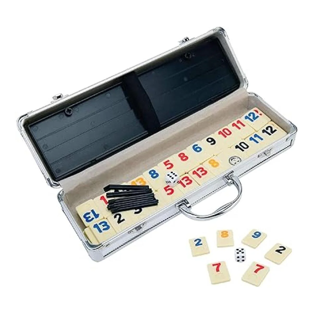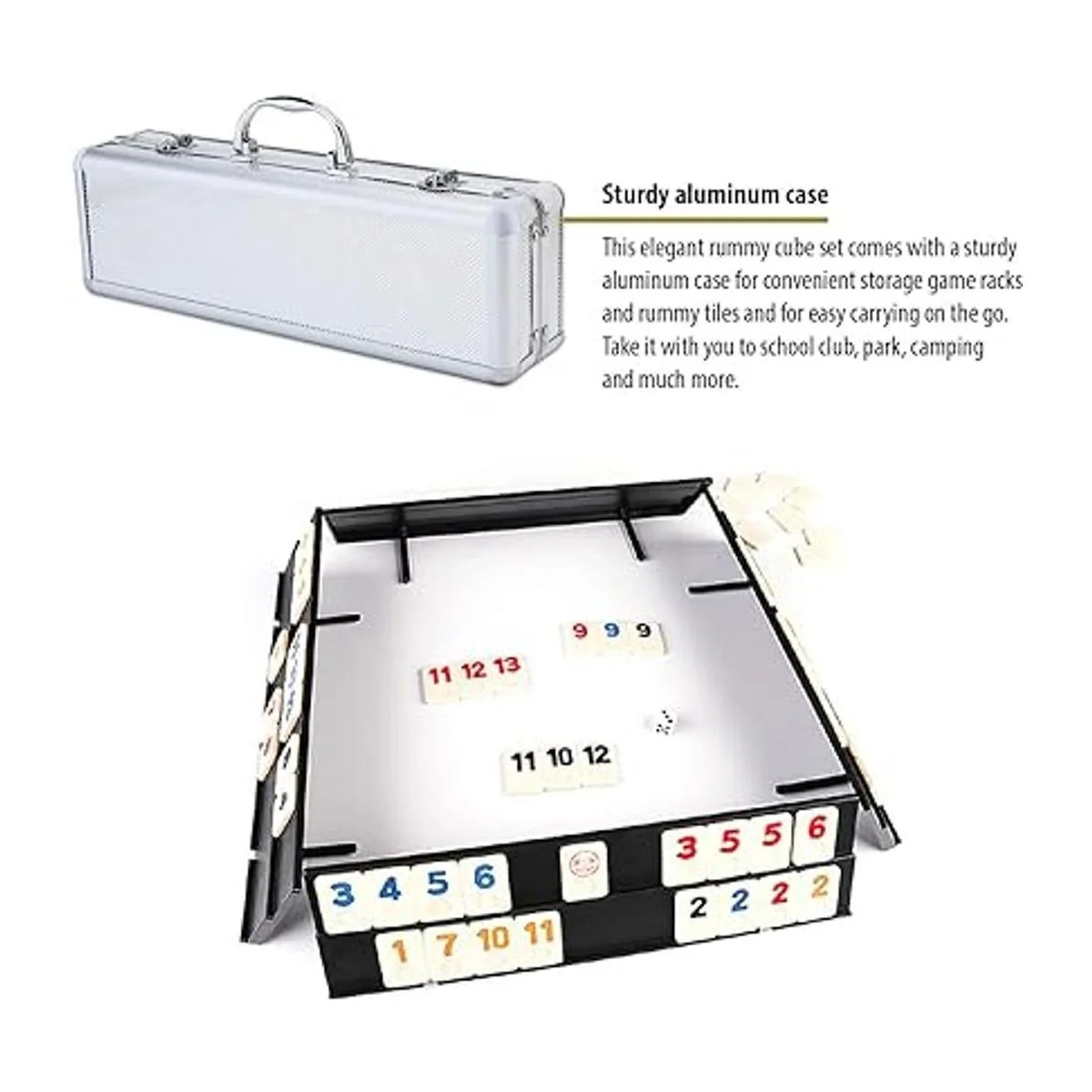 Este elegante juego de cubos viene con una resistente caja de aluminio para un almacenamiento cómodo. 1 funda de transporte de aluminio 106 azulejos de Rummy 4 estantes de plástico 1 dados. Llévalo contigo al club escolar, parque, camping y mucho más.