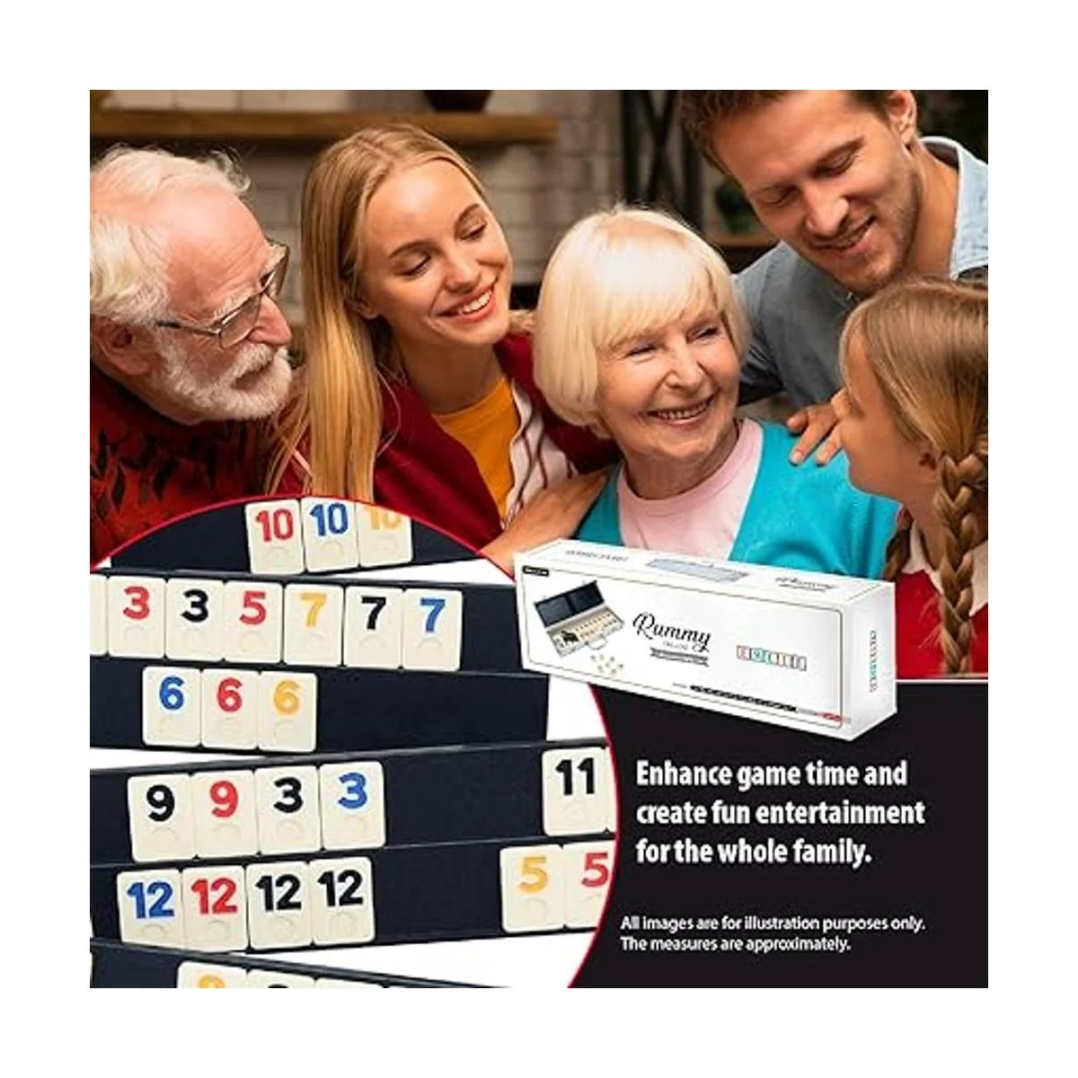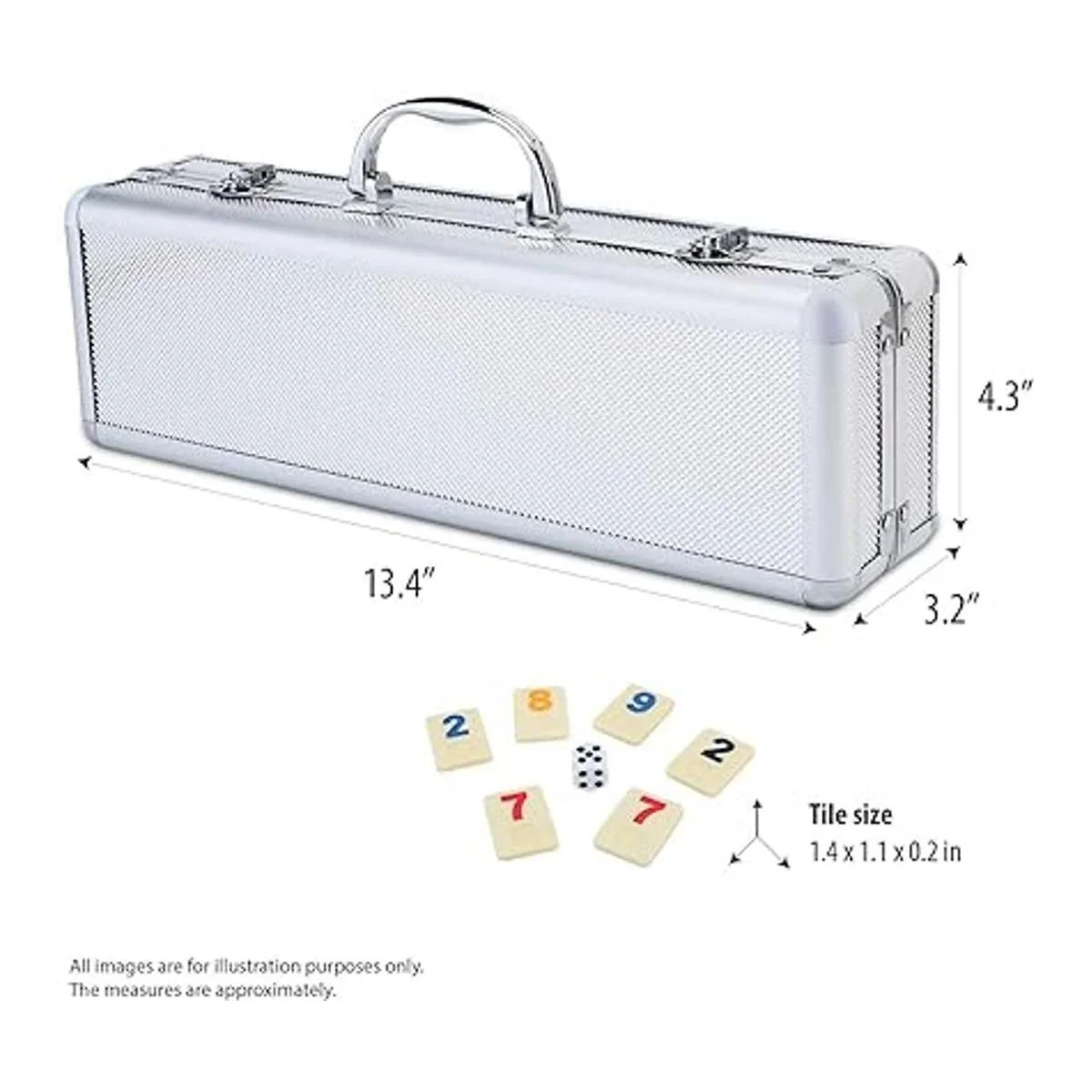 Juego de 106 fichas Rummy Tiles, juego de viaje de color duradero con funda de aluminio y 4 bandejas antideslizantes duraderas. Tablero. 106 azulejos, 4 jugadores. Edición de lujo.
