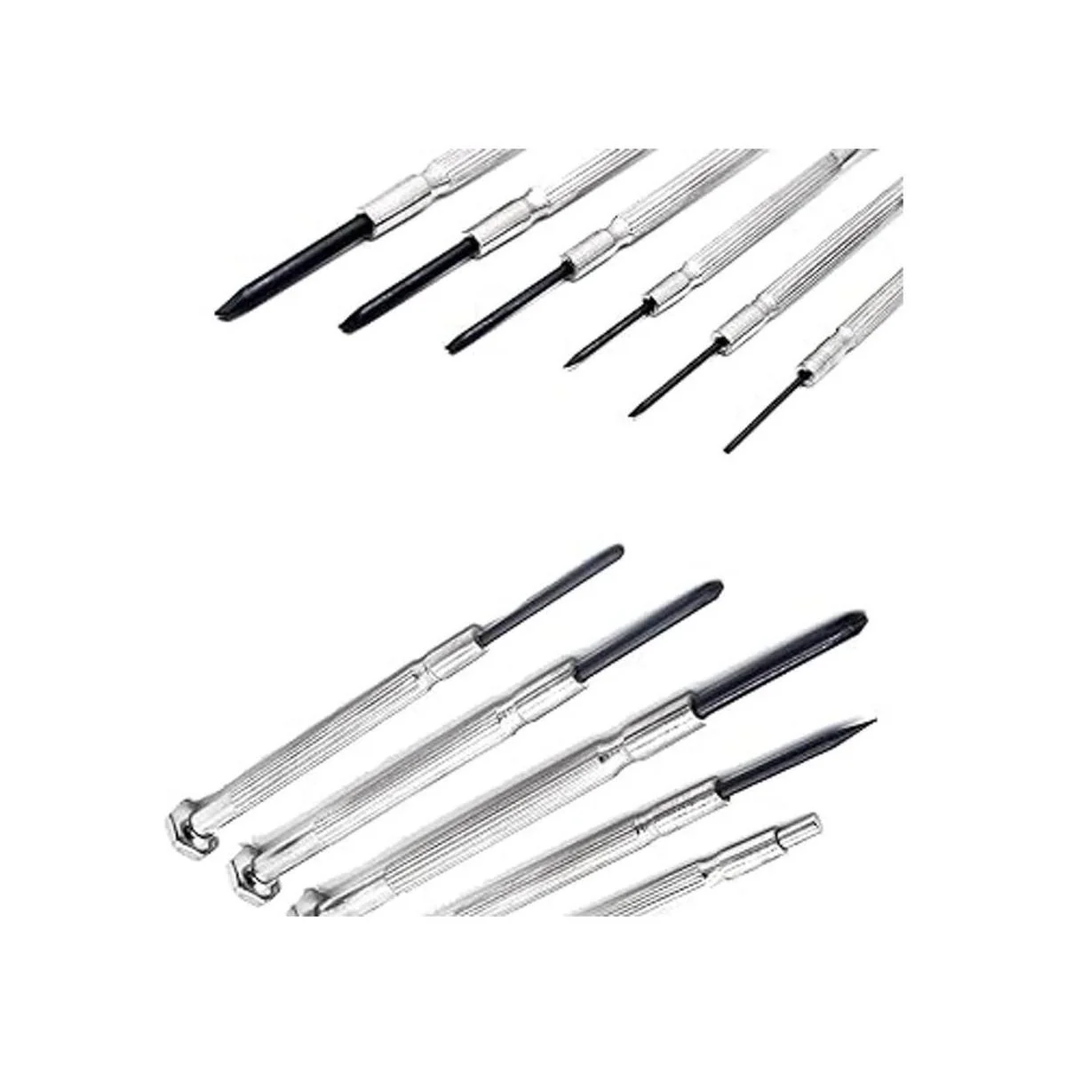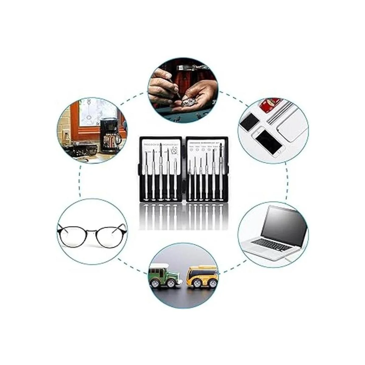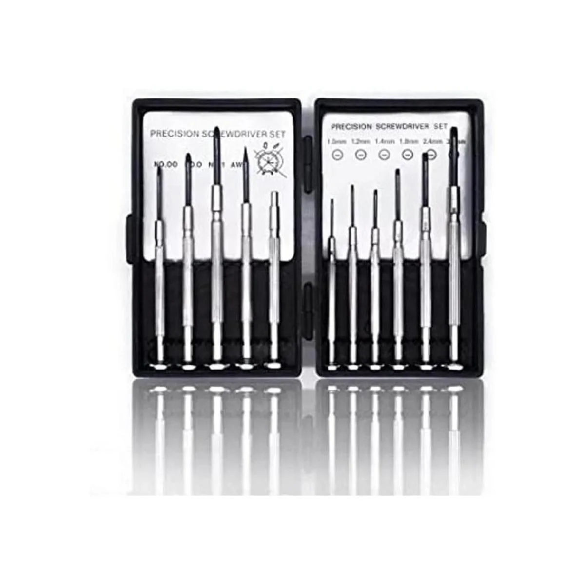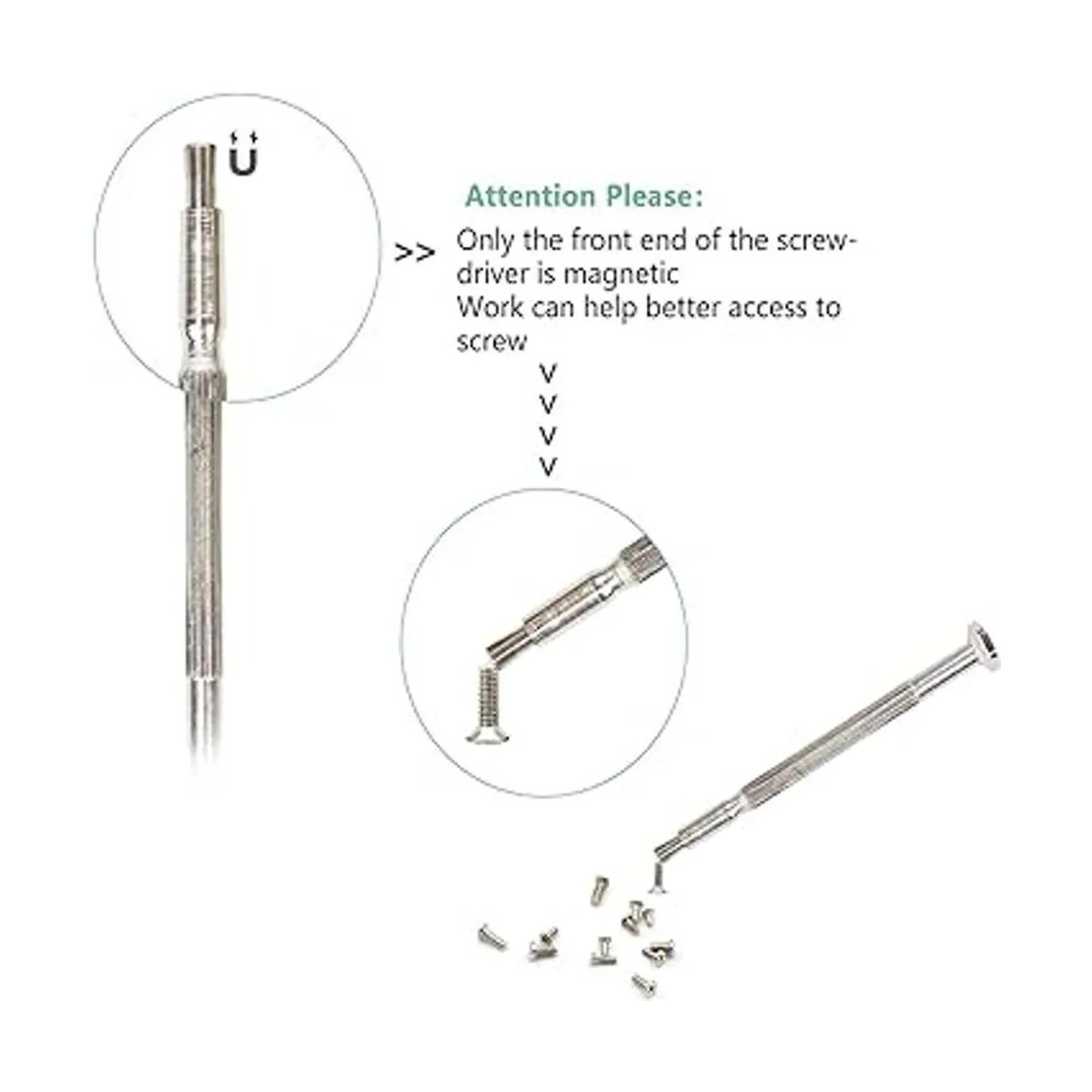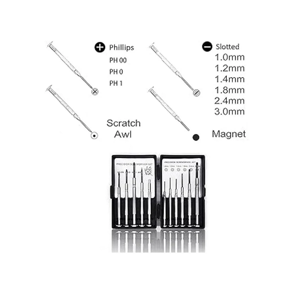 11 tamaños diferentes : 3 tamaños Phillips 00, 0, 1; 6 tamaños de cabeza plana 0.039 in, 0.047 in, 0.055 in, 0.071 in, 0.094 in, 0.118 in; 1 punzón; 1 magnético; el juego de mini destornilladores es una buena opción para relojes, electrónica, joyas, reparación de gafas y otras fijaciones de tornillos pequeños.