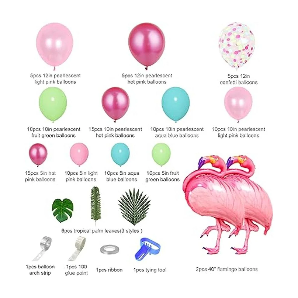 Los suministros de decoración de fiesta de flamenco incluyen: 117 globos tropicales incluye: 5 globos de confeti de 12 pulgadas, 10 globos nacarados de 12 pulgadas 5 rosa caliente, 5 rosa claro, 45 globos nacarados de 10 pulgadas 15 rosa caliente, 10 rosa claro, 10 azul aguamarina, 10 verde fruta, 45 globos de 5 globos de 5 globos de 5 pulgadas 10 pulgadas 10 rosa claro, 10 rosa claro, 10 un azul, 10fruit 10fruit verde, 6 hojas de palma tropicales 3 estilos, 2 globos de flamenco de 40 pulgadas, 1 herramienta de atado, 1 cinta, 1 tira de arco de globos, 1 punta de pegamento 100.