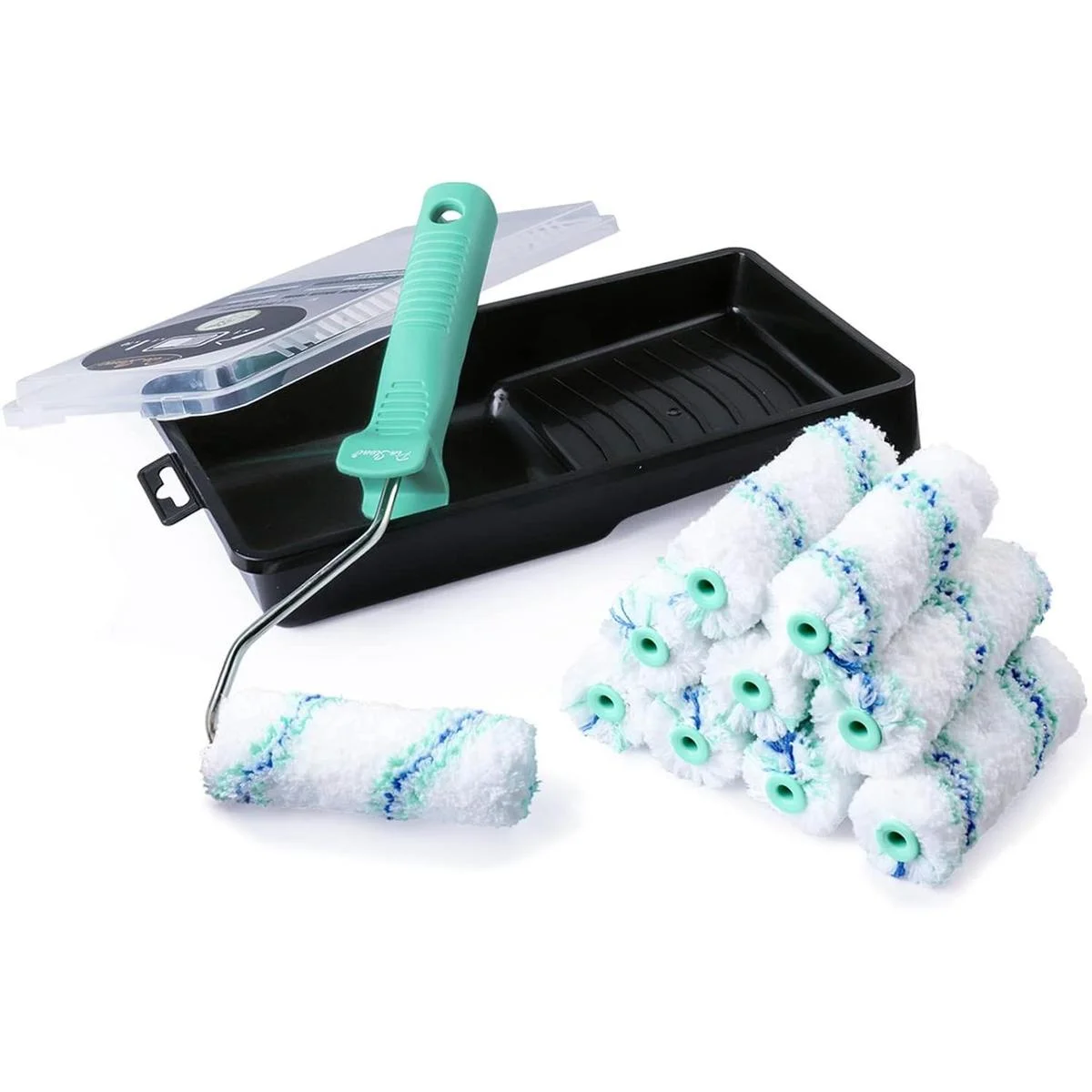 Kit de rodillo de pintura de buen valor: incluye 1 mini bandeja de pintura de 6 pulgadas con tapa, 1 mini cepillo de rodillo de pintura de 4 pulgadas, 10 cubiertas de rodillo de pintura de microfibra NAP de 4 pulgadas y 1/2 pulgadas. Todo es fácil de limpiar y reutilizar.