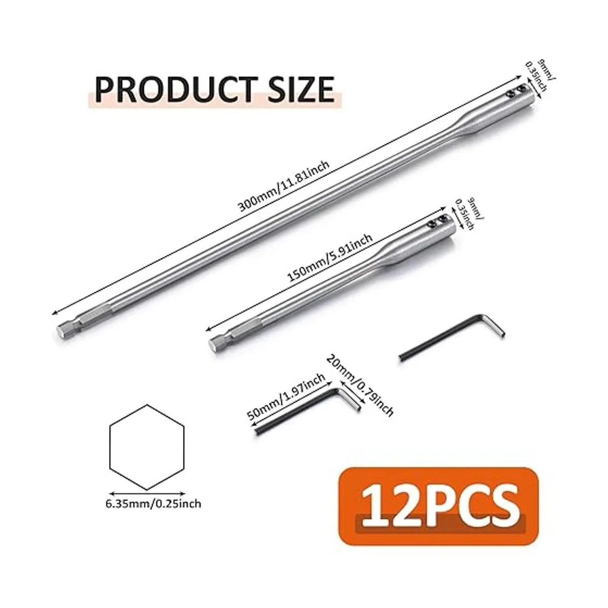 2 tamaños de longitud: las extensiones de broca tienen 2 tamaños diferentes, respectivamente son de 6 pulgadas y 12 pulgadas, aportando más comodidad a tu trabajo y ofreciendo más opciones para ti, y son adecuadas para la mayoría de insertos de vástago hexagonal de extensión de broca de 1/4 pulgadas y brocas de potencia; comprueba el tamaño antes de comprar