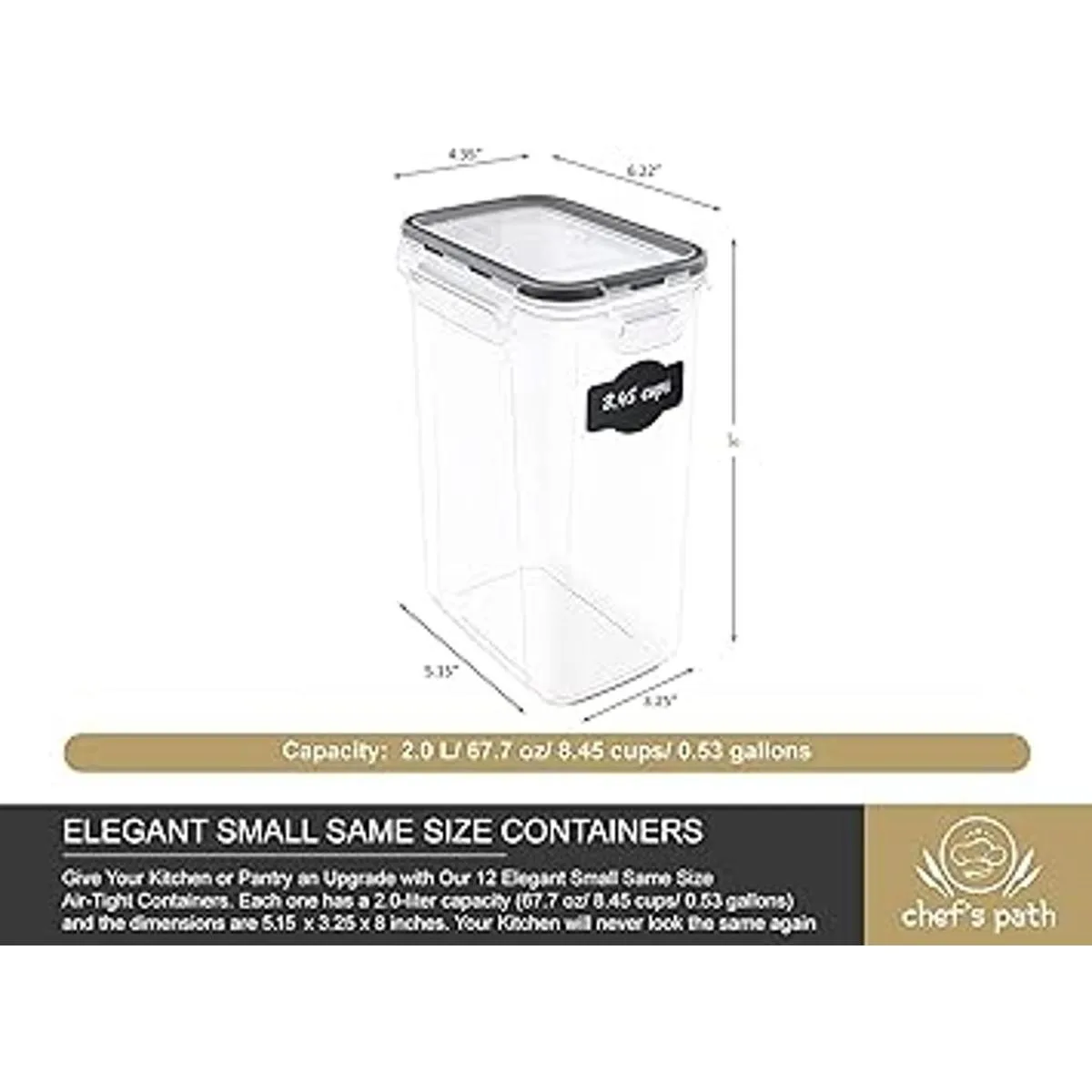 Elegantes recipientes de cocina: dale a tu cocina y despensa una actualización con nuestros 12 elegantes recipientes herméticos de almacenamiento con tapas. Cada uno tiene una capacidad de litro 67.7 onzas/8.45 tazas/0.53 galones y las dimensiones son 5.15 x 3.25 x 8 pulgadas.