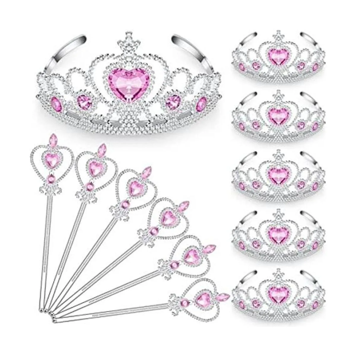 Juego de 12 tiara y varita de coronas de princesa para niña pequeña con forma de corazón plateado, tiara de plástico, varita de invierno para cumpleaños estilo corazón rosa