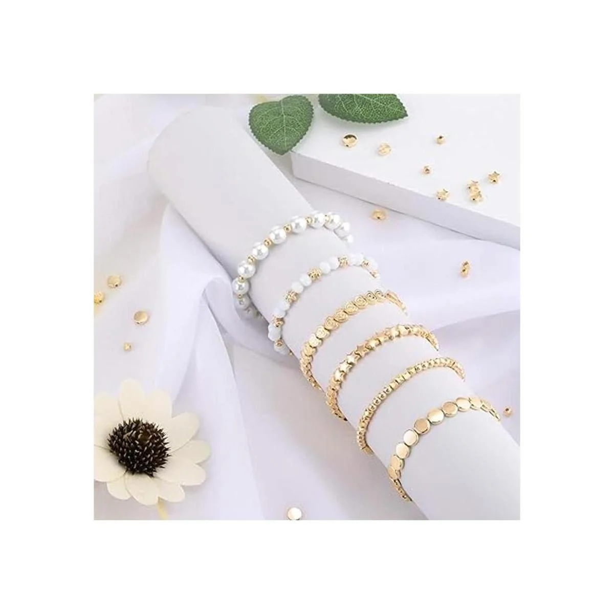 Juego de 1200 cuentas espaciadoras de estrellas, cuentas redondas de bola rondelle, cuentas espaciadoras facetadas de corazón, cuentas de flores, cuentas de disco plano, cuentas sueltas para pulseras, aretes, collares, joyas (dorado)