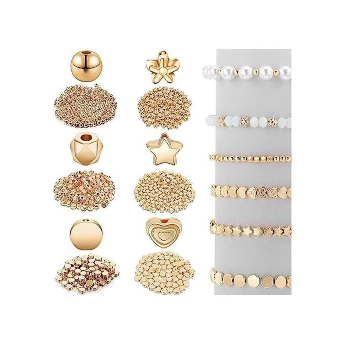 Juego de 1200 cuentas espaciadoras de estrellas, cuentas redondas de bola rondelle, cuentas espaciadoras facetadas de corazón, cuentas de flores, cuentas de disco plano, cuentas sueltas para pulseras, aretes, collares, joyas dorado