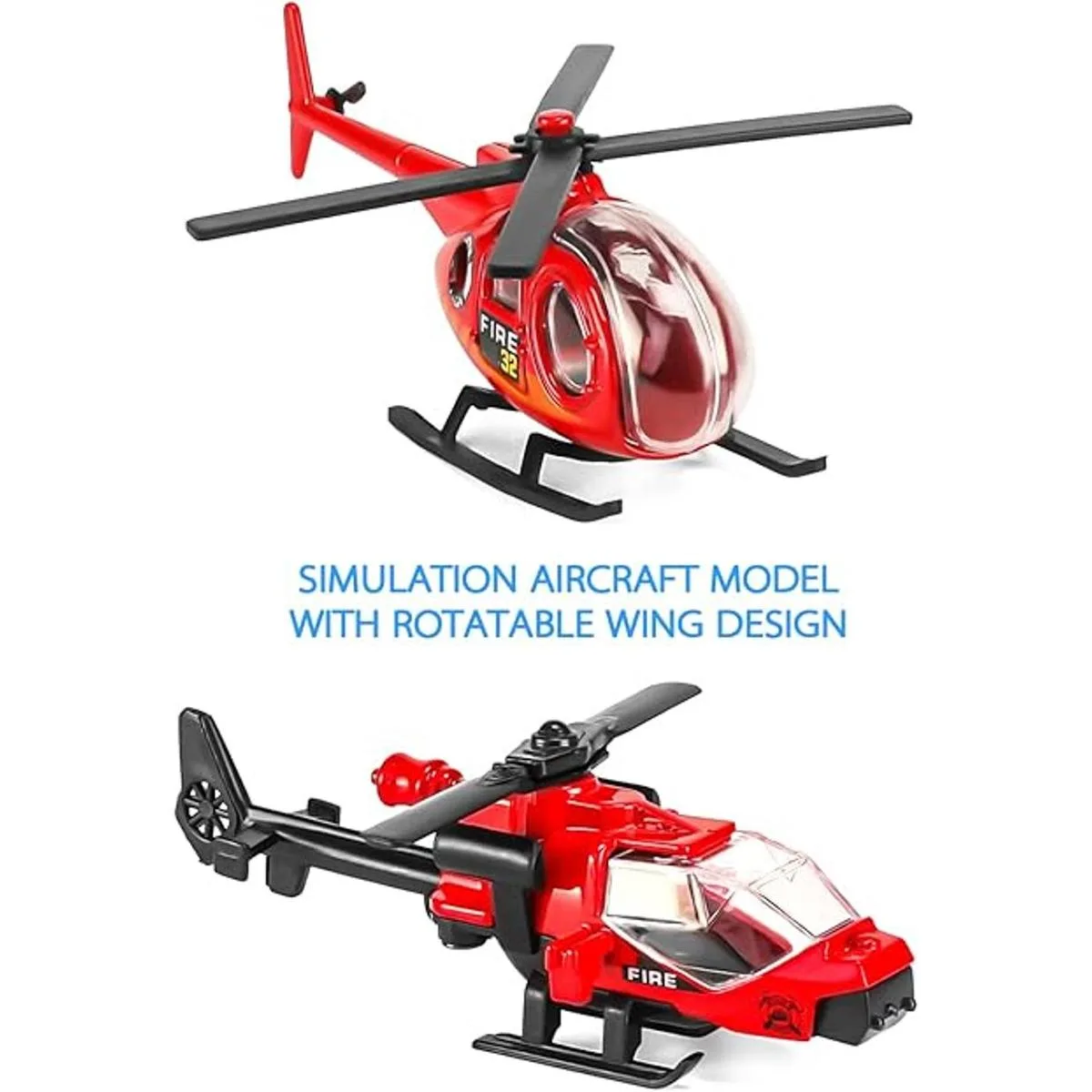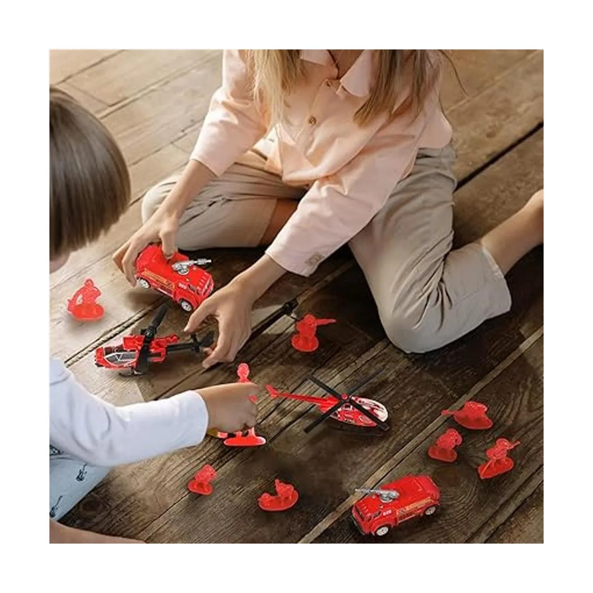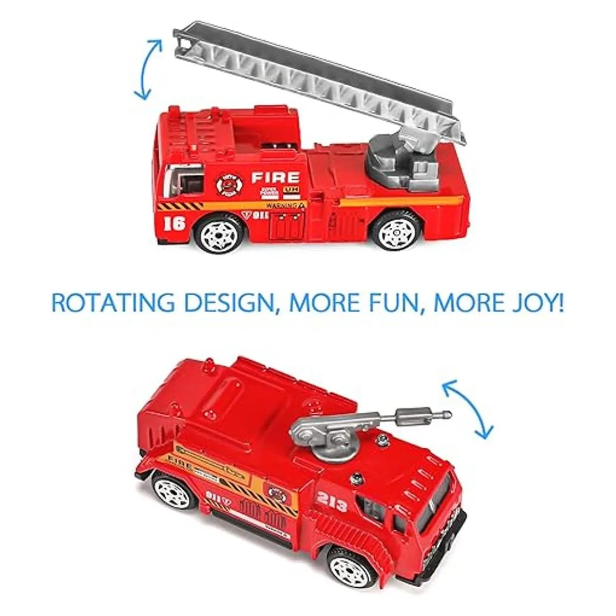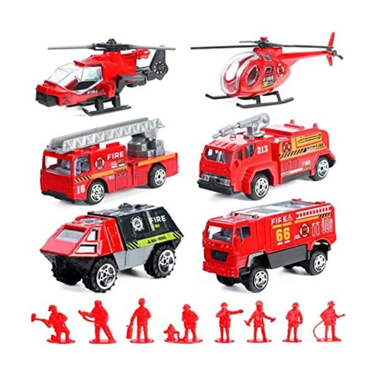 6 camiones de bomberos surtidos con 8 bomberos, incluye helicóptero de rescate, vehículo de bomberos, camión escalera, etc. Las piezas de trabajo de los vehículos de bomberos se pueden girar, lo que hace que tu pequeño héroe sienta que se está llevando a cabo una misión de rescate de emergencia.