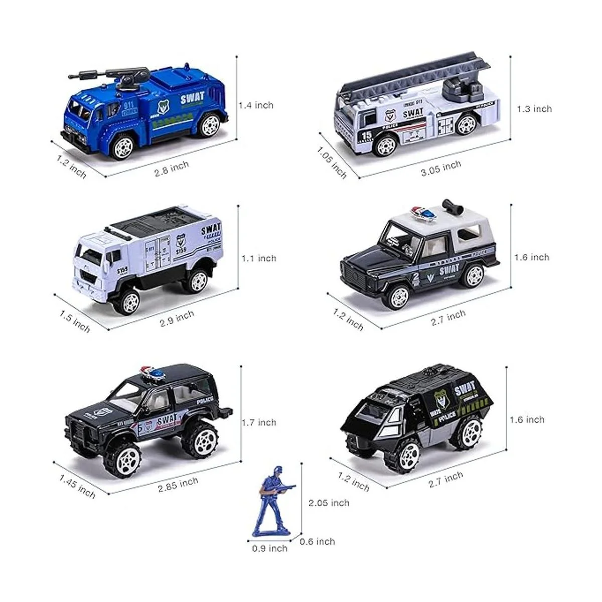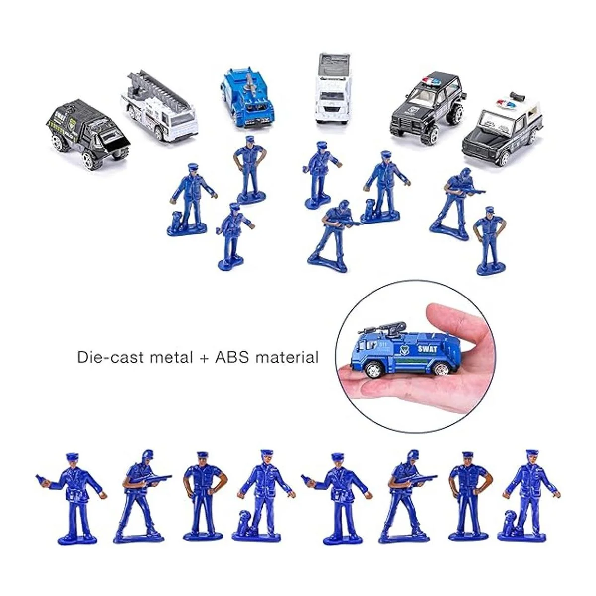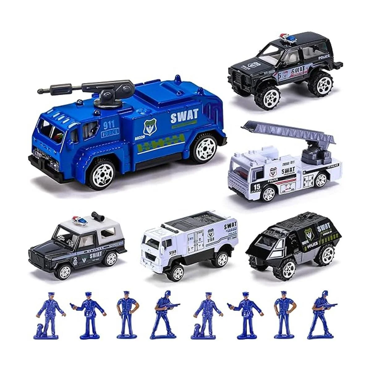 Camión de rescate de policía: 6 mini camiones de rescate de policía surtidos con 8 policías. Los coches de juguete detallados crean un mundo mágico para los niños.