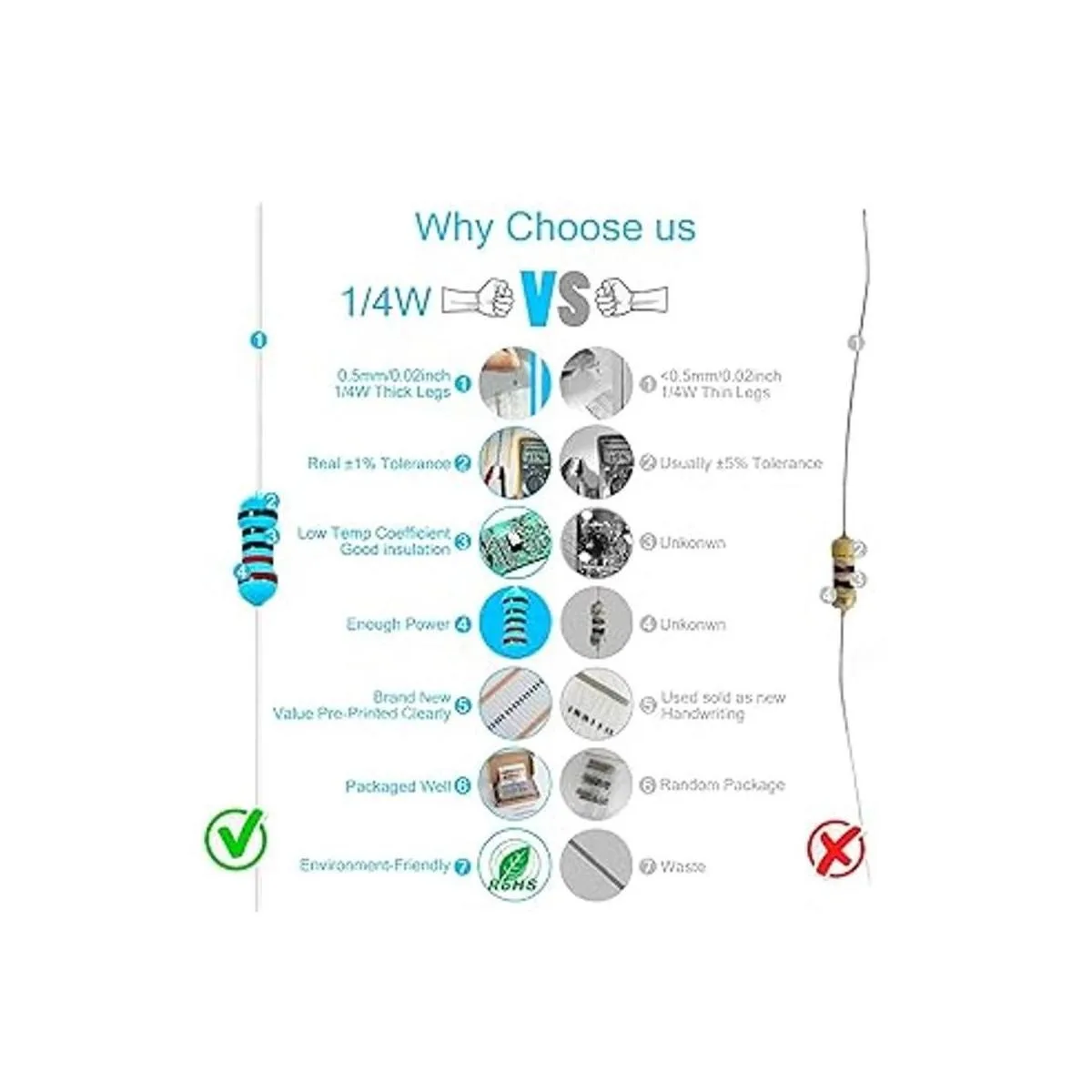 Alta calidad : Tolerancia de resistencia: 1; Potencia: 1/4 W. Película de metal de 1/4 W y pines de metal más gruesos para una mejor conexión, bajo coeficiente de temperatura y rendimiento estable, que te ayudan a completar los experimentos eléctricos más rápido y suave