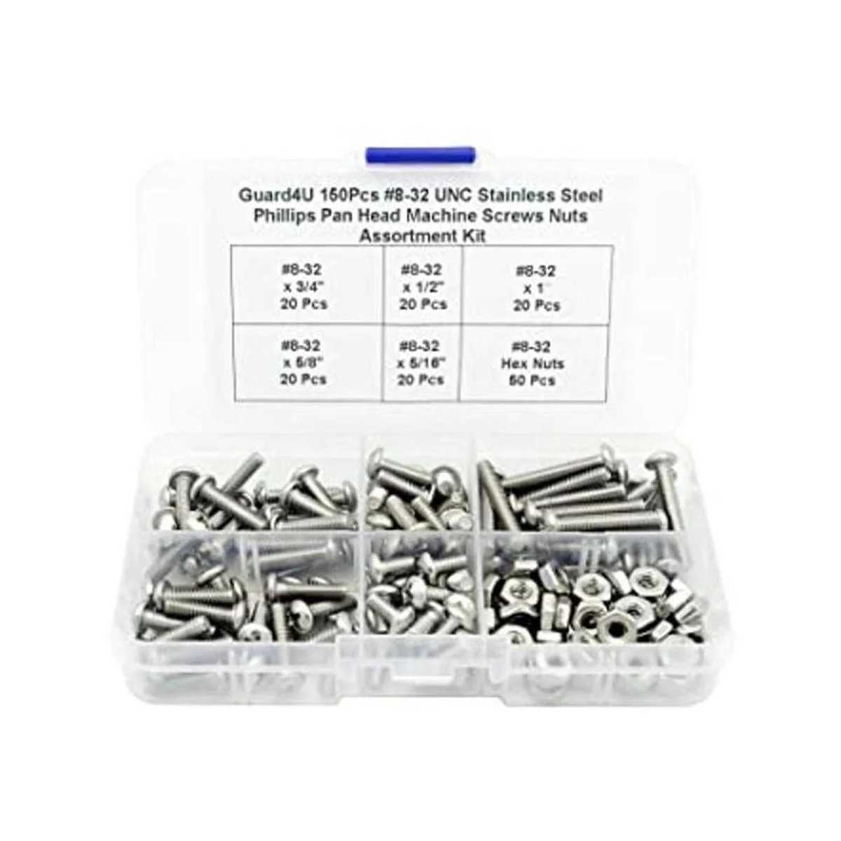 El kit contiene: tamaños SAE 8 32 x 5/16 pulgadas, 8 32 x 1/2 pulgadas, 8 32 x 5/8 pulgadas, 8 32 x 1 pulgada cada 20 piezas, tuerca 50 piezas. Muchos tamaños diferentes pueden satisfacer tus múltiples necesidades.