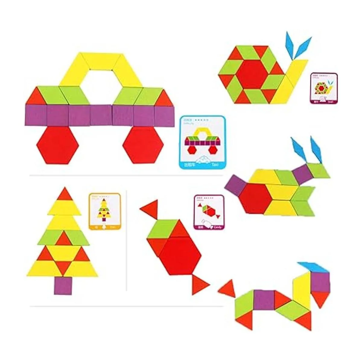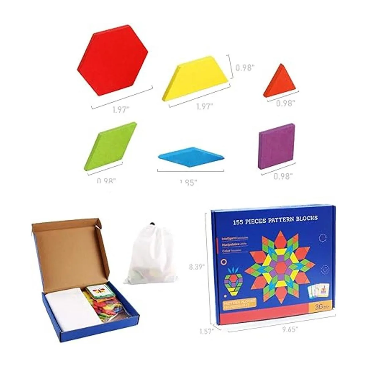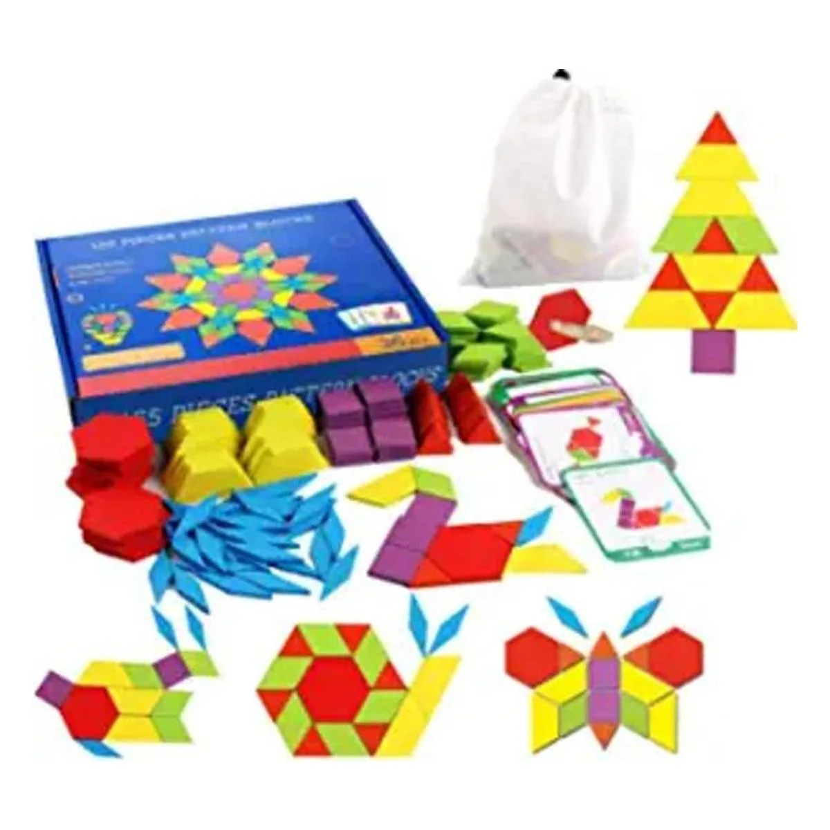 Incluye: 155 bloques de patrón con 6 formas y colores resistentes diferentes, 24 tarjetas de diseño y 1 bolsa de almacenamiento. Varias formas incluyen cuadrados morados, hexágonos rojos, trapecios amarillos, paralelogramos verdes, rombo delgado azul y triángulos rojos. Se incluye una bolsa con cordón para un fácil viaje y almacenamiento.