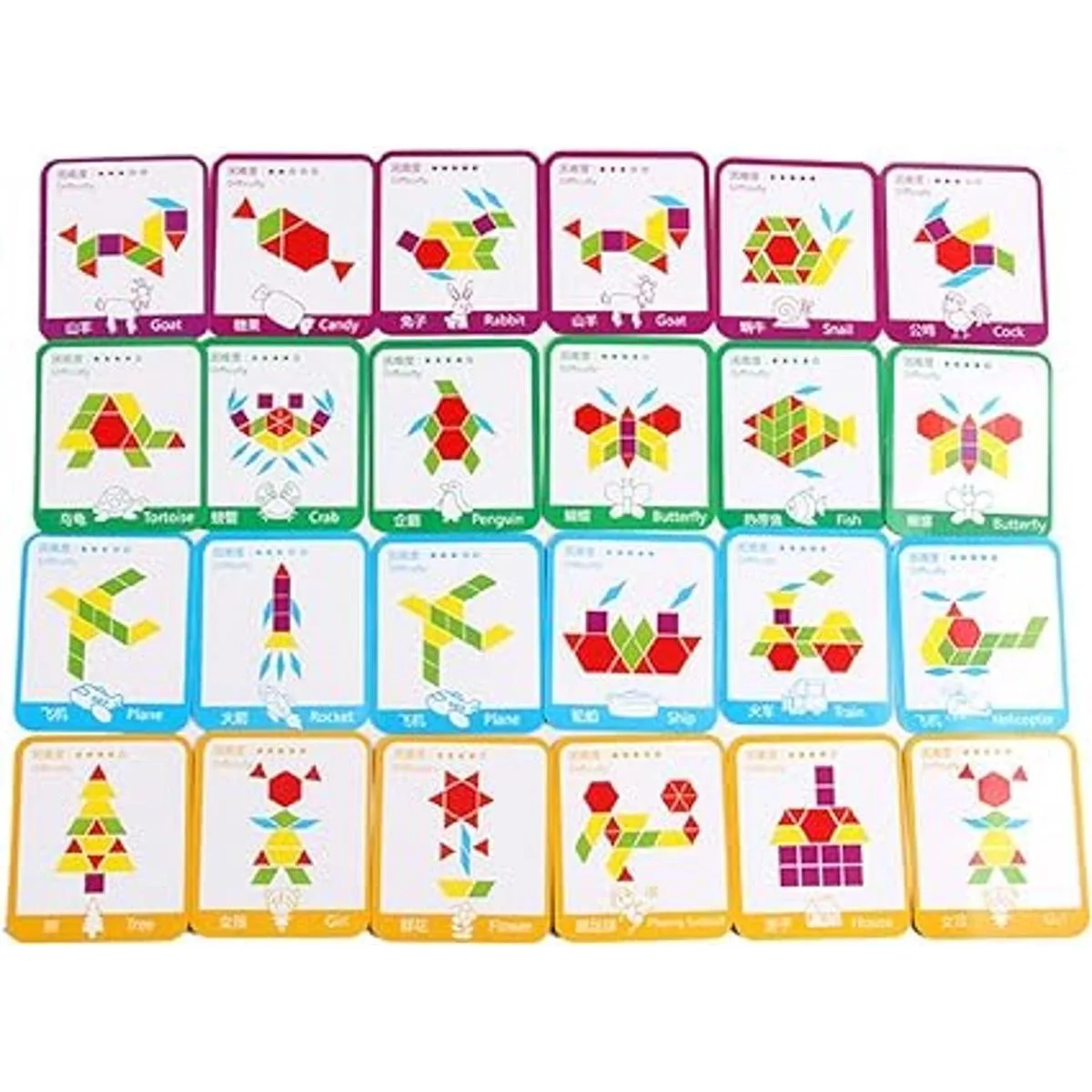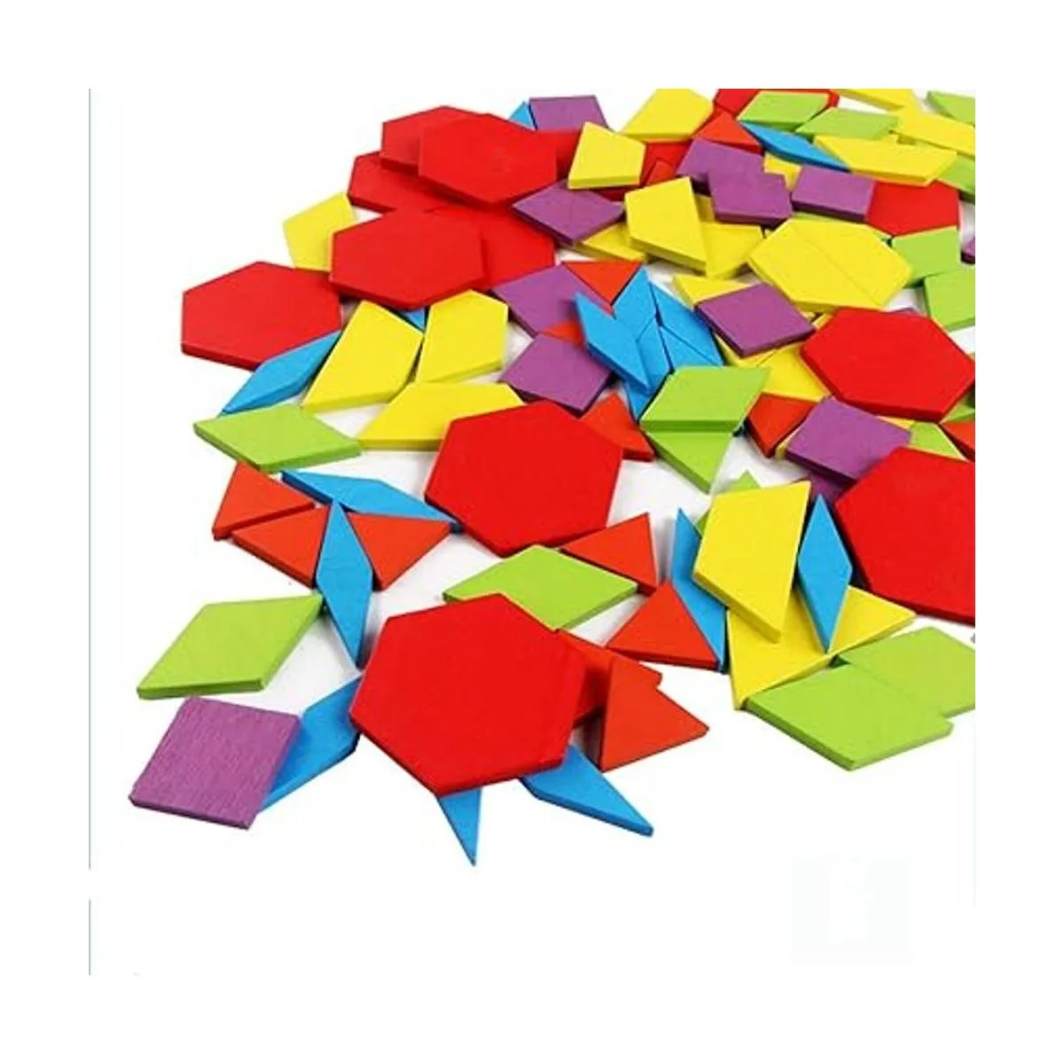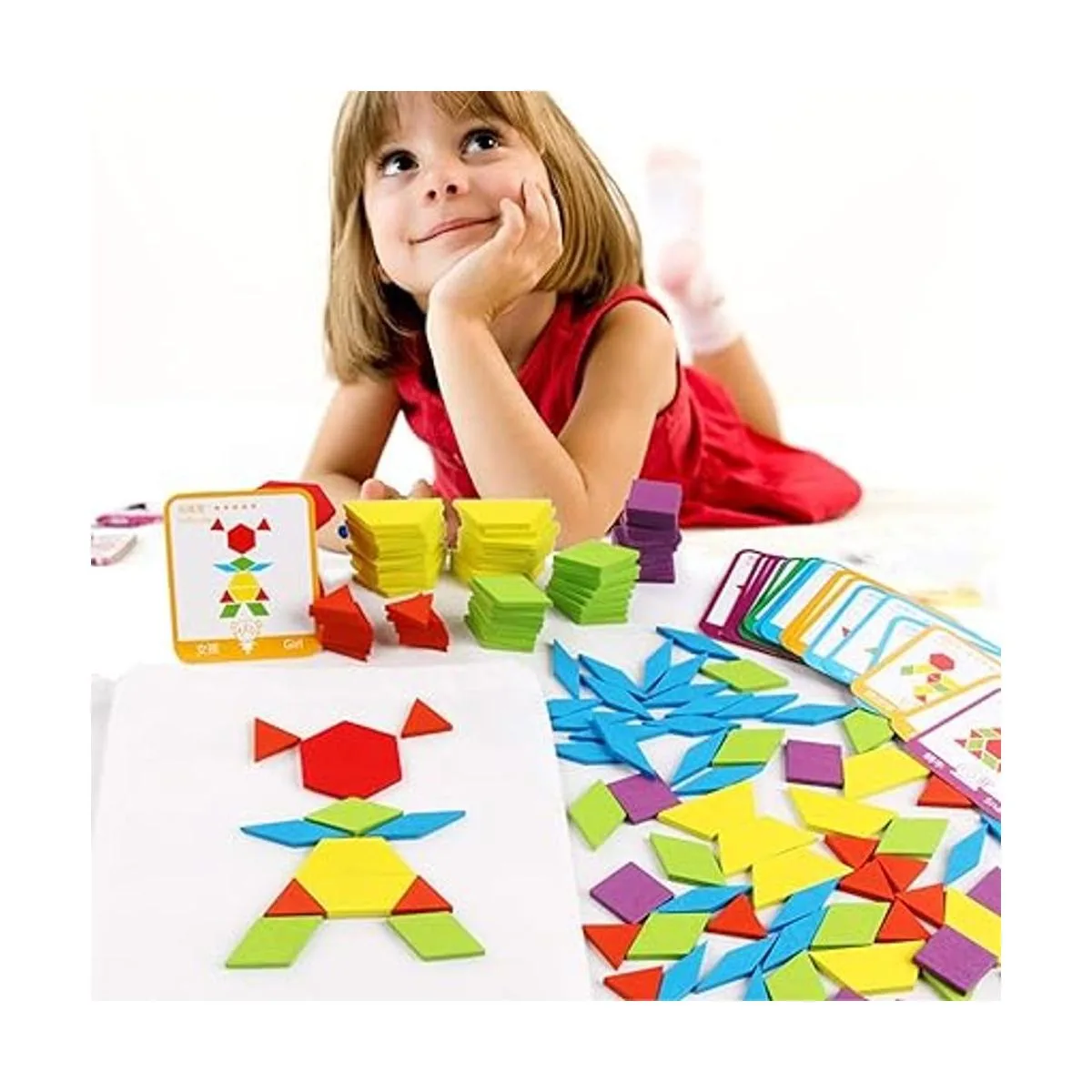 Incluye: 155 bloques de patrón con 6 formas y colores resistentes diferentes, 24 tarjetas de diseño y 1 bolsa de almacenamiento. Varias formas incluyen cuadrados morados, hexágonos rojos, trapecios amarillos, paralelogramos verdes, rombo delgado azul y triángulos rojos. Se incluye una bolsa con cordón para un fácil viaje y almacenamiento.
