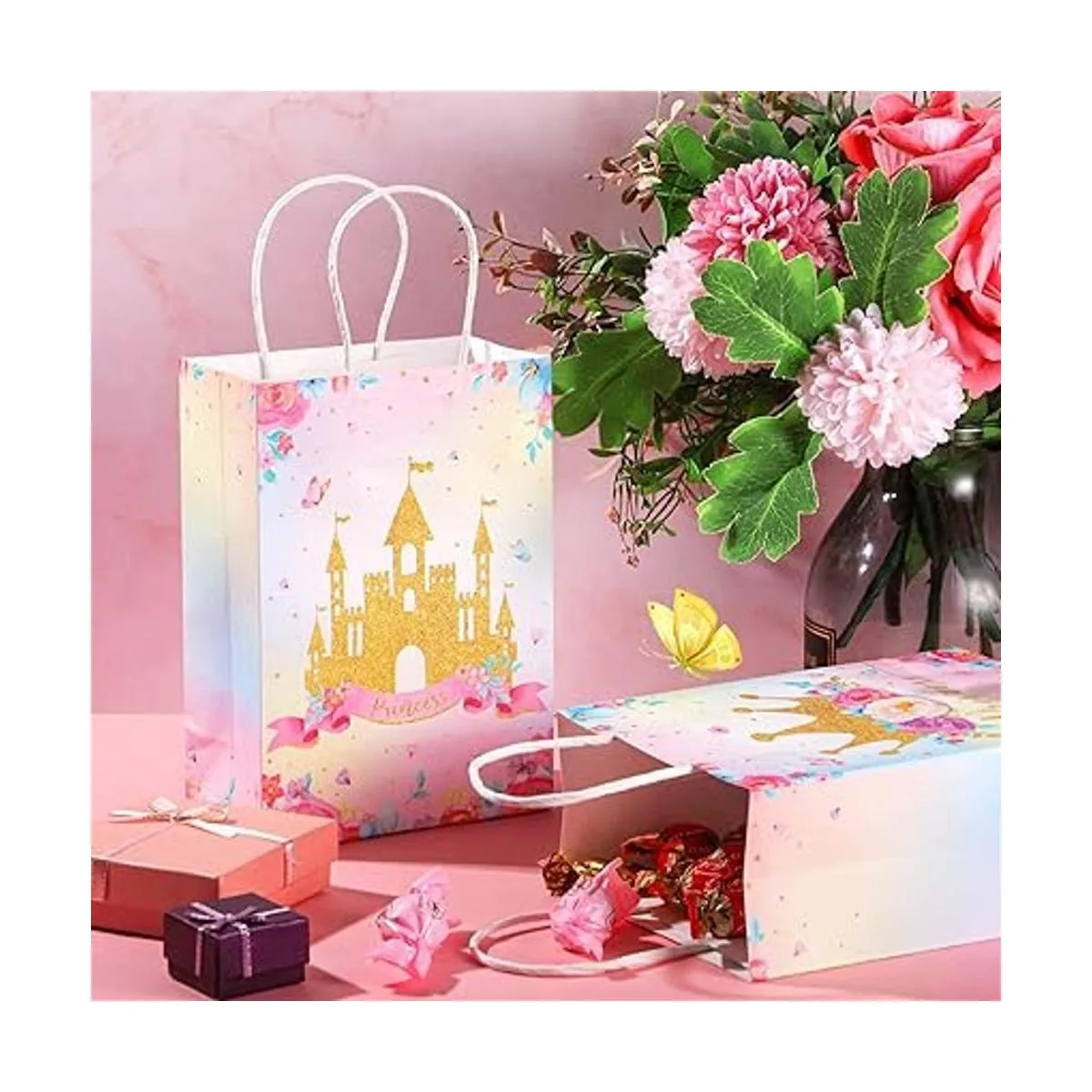 Tema de princesa floral: estas bolsas de regalo de princesa están bellamente diseñadas con papel rosa Sydney; el fondo es de flores rosas, impreso con varios elementos de princesa, castillo de sueños, corona dorada, princesa intermitente, para que tu niña cree un buen ambiente de fiesta, para que tus invitados dejen recuerdos inolvidables