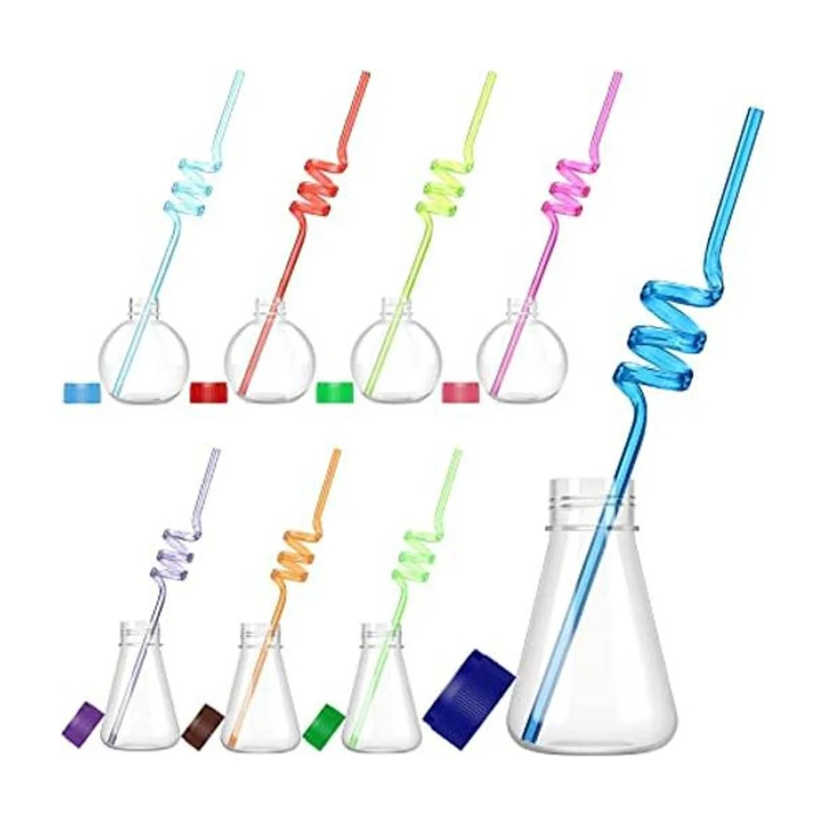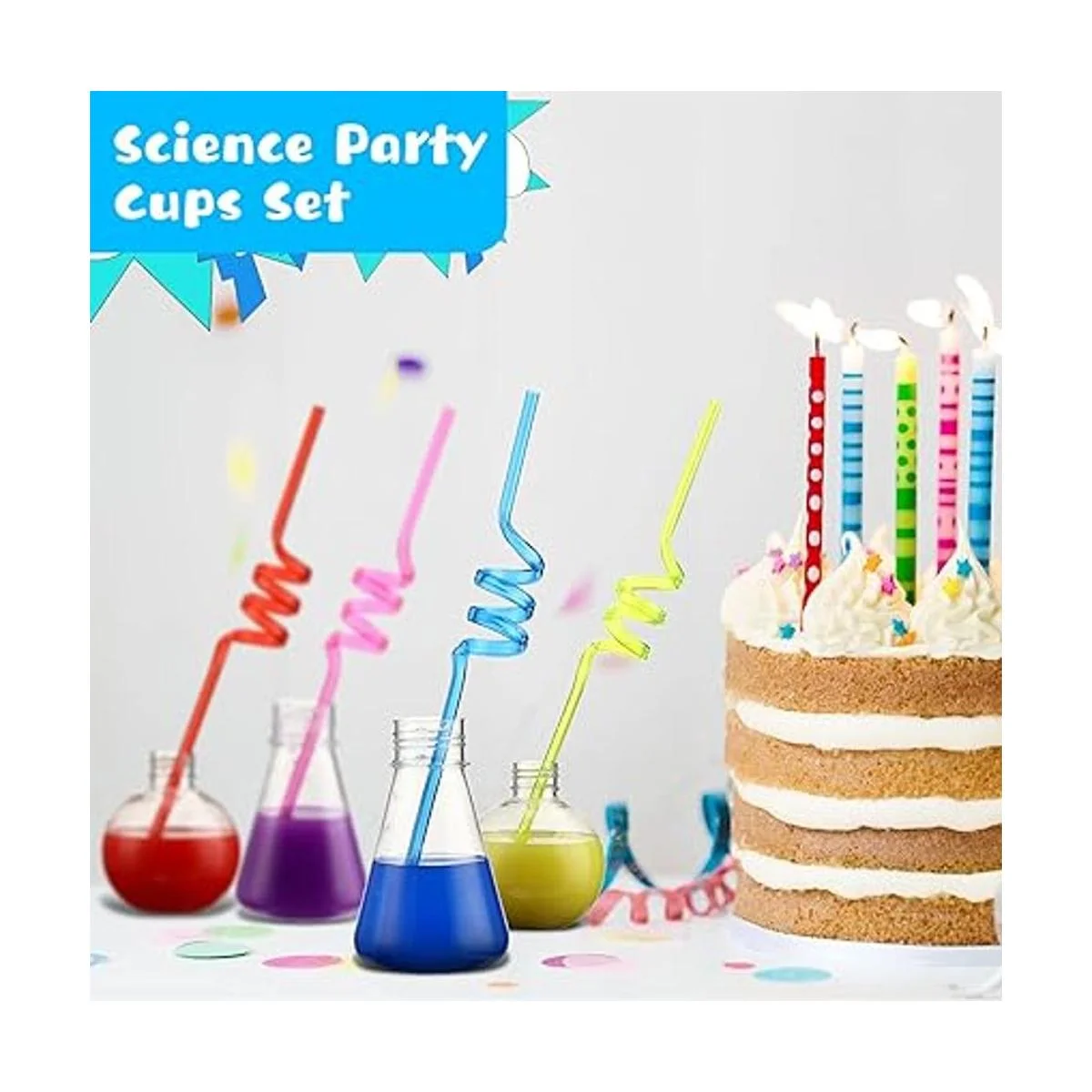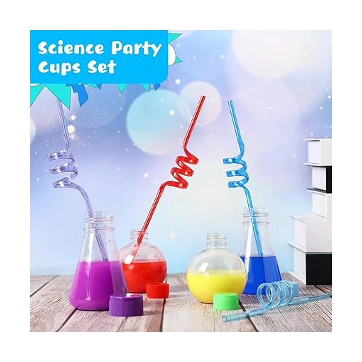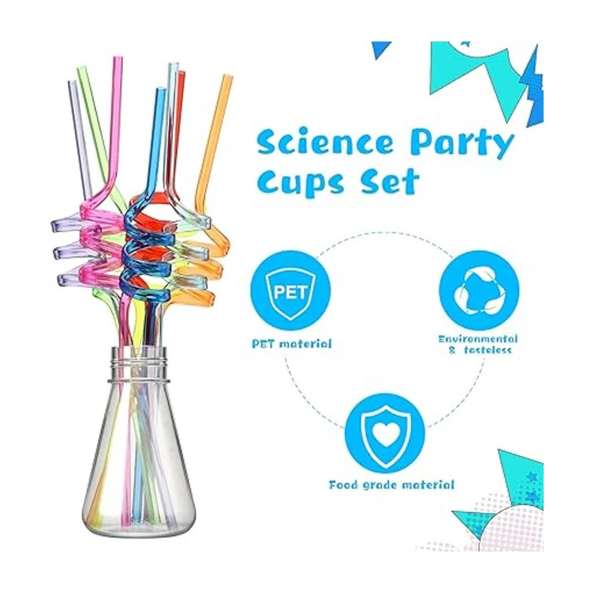 Juego de 16 tazas temáticas de fiesta de ciencia con pajitas de bucle tonto, frasco cónico reutilizable de plástico con forma de frasco de fondo redondo y divertidas pajitas coloridas para decoraciones de fiesta de ciencia