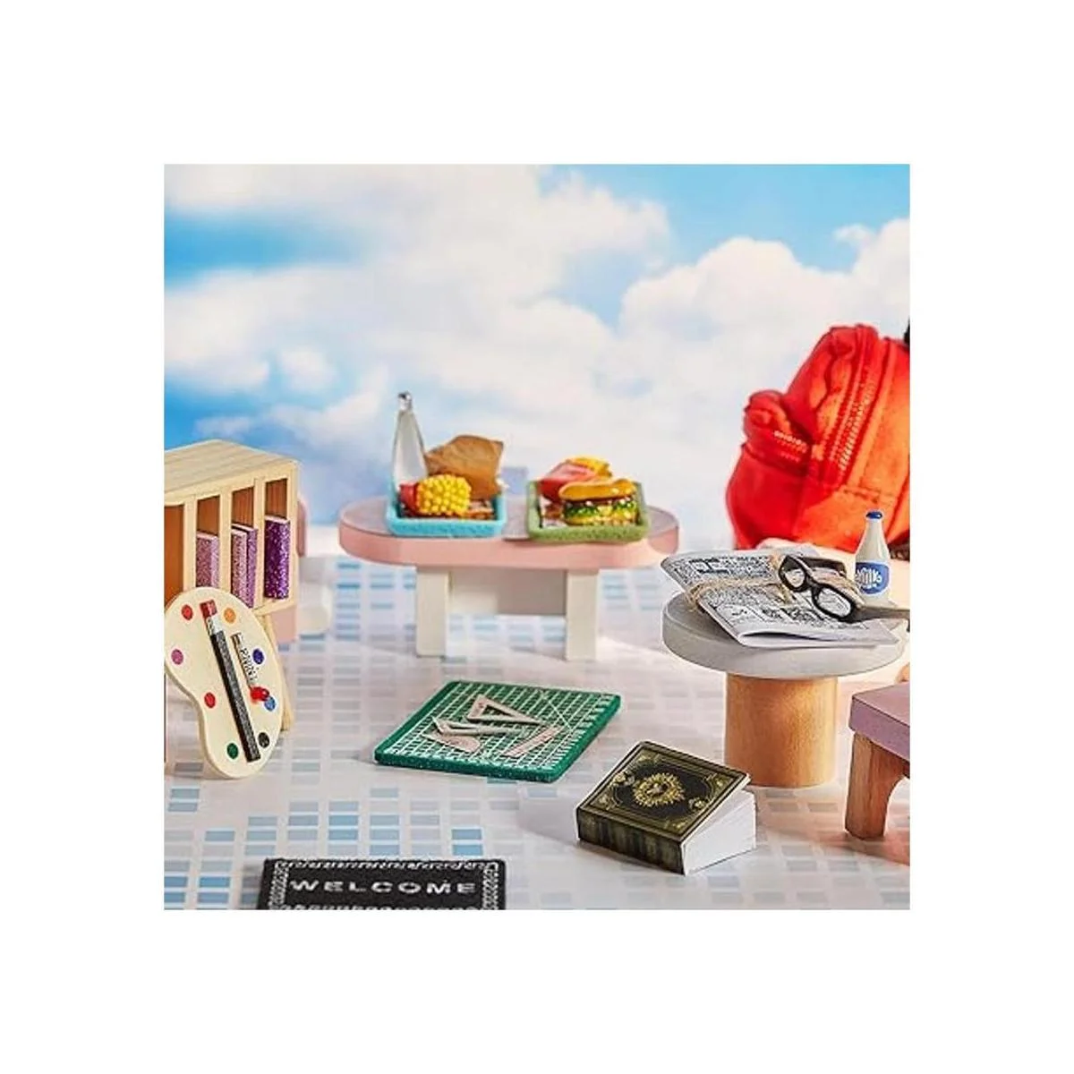 El bonito juego escolar: este paquete te proporciona un accesorio decorativo para la casa, incluyendo bolsas escolares, reglas, libros, alimentos, bebidas, tablas de dibujo, periódicos, vasos y más, que contiene no solo suministros escolares, sino también alimentos que puedes utilizar para simular varios escenarios de casa de muñecas, este es un juego ideal