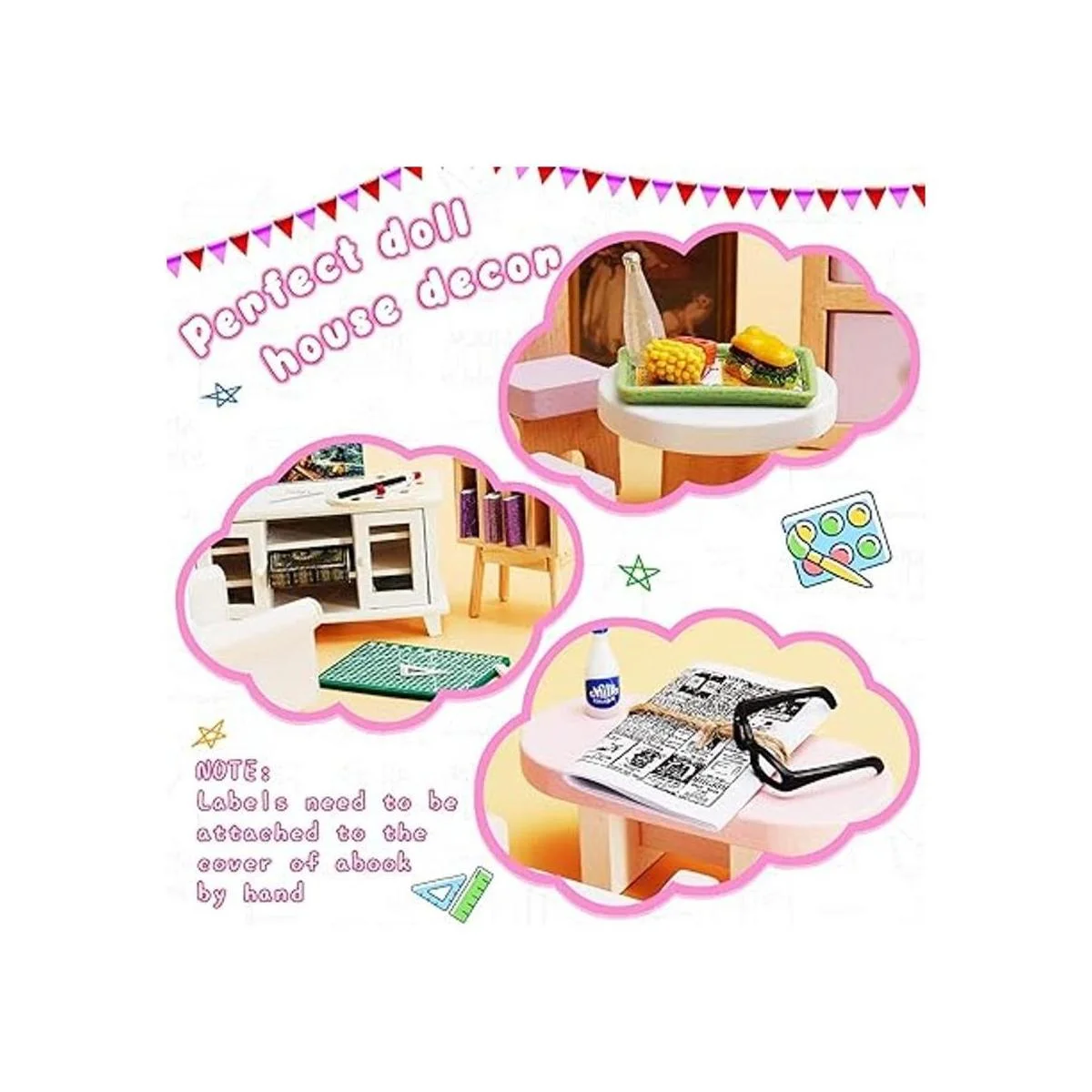 Información específica del paquete: nuestros accesorios en miniatura incluyen 1 mochila roja, 1 juego de hamburguesas y papas fritas, 1 juego de patatas fritas de perro caliente, 1 paleta de pizarra de dibujo falsa, 1 mini tabla de cortar, 4 reglas, 1 botella de leche roja, 1 botella de leche azul, 1 bebida de jugo, 2 libros clásicos incluyendo 1 libro negro y 1 libro clásico rojo, 4 libros esmerilado, 1 paquete de papel de papel aluminio esmerilado, 1 paquete de periódico y 1 par de periódico y 1 par de vasos. la cantidad suficiente para ti para decorar tu casa de muñecas y también puedes compartirlos con tus amigos