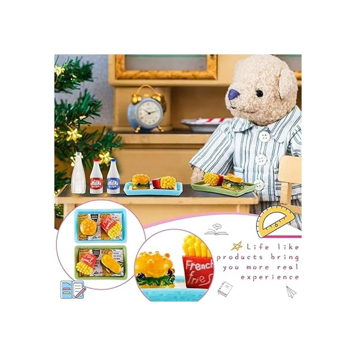 Juego de 17 piezas de mini material escolar para muñecas de suministros escolares en miniatura, accesorios para la casa de muñecas miniaturas, suministros escolares para muñecas, juego de juguetes de comida en miniatura, hamburguesas, papas fritas, jugo, comida rápida, juguetes de juego de simulación