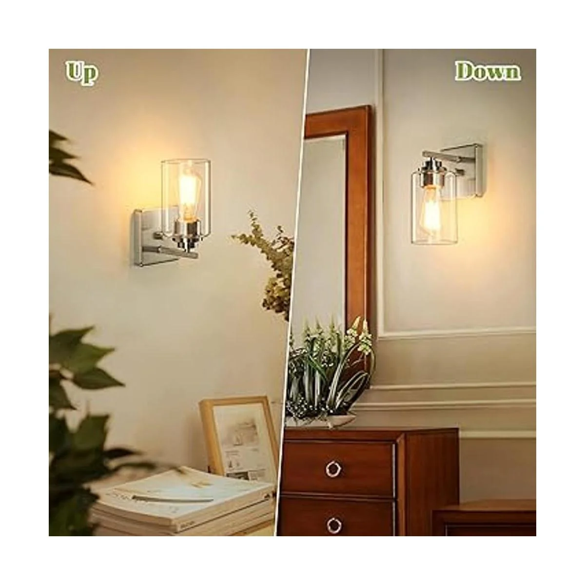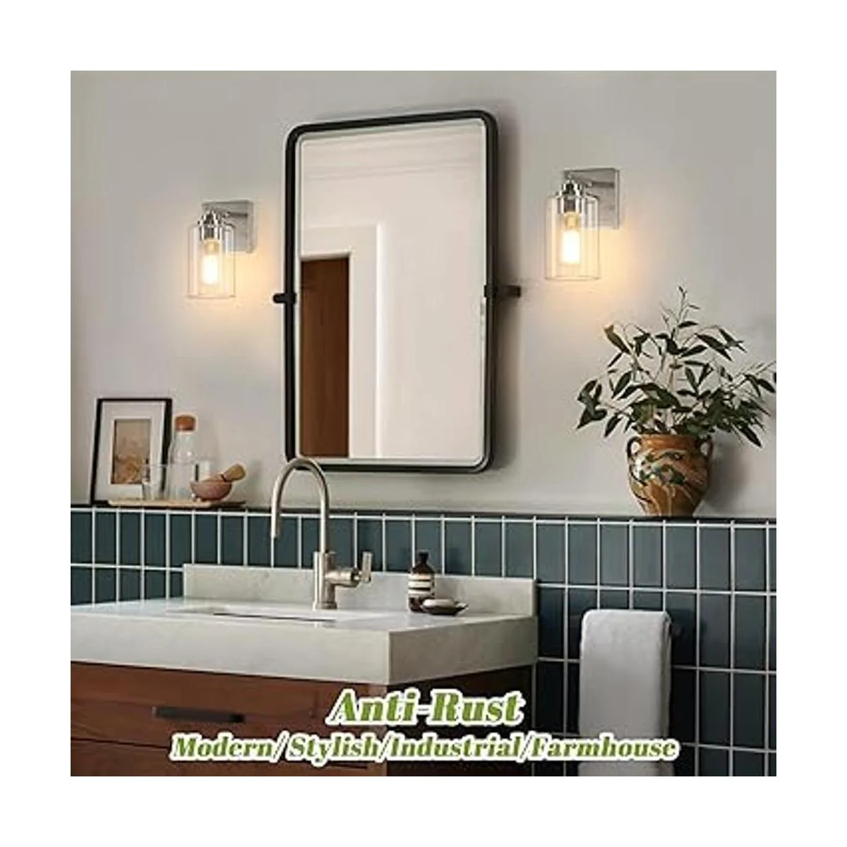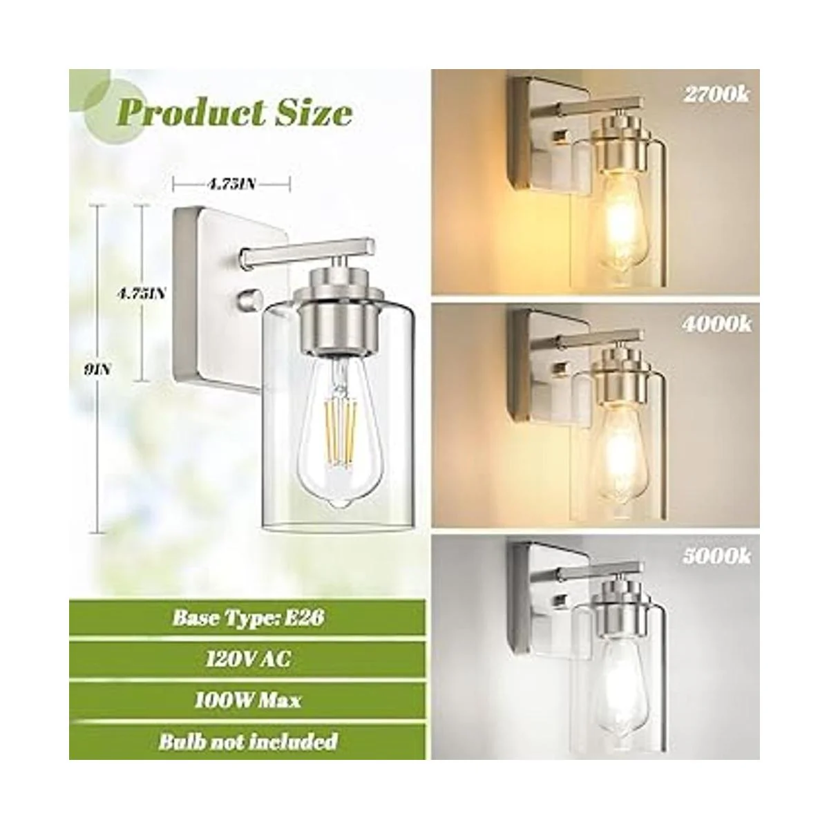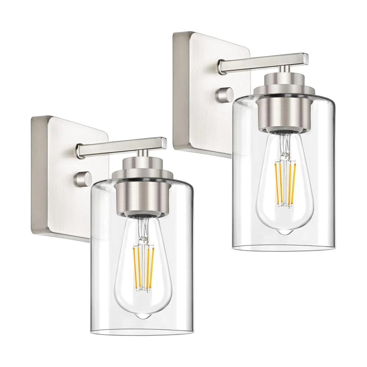Juego de 2 apliques de pared para baño, lámparas de tocador de níquel cepillado, modernas linternas de iluminación de montaje en pared, lámparas de pared de granja con pantalla de vidrio transparente para dormitorio, sala de estar, espejo, pasillo, porche