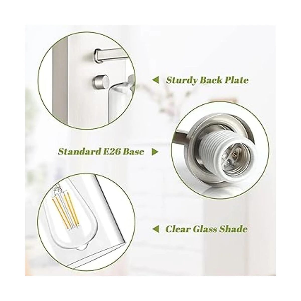 Aplicación superamplia : diseñadas con un acabado de níquel cepillado y una forma de vidrio cilíndrico, estas lámparas de baño son adecuadas para el hogar en interiores, también se pueden utilizar como una lámpara de lectura, luz de tocador, luz de espejo de baño, lámpara de pared de dormitorio. Mientras tanto, esta linterna de pared se puede utilizar ampliamente en el jardín, porche, balcón, puerta, pasillo, patio y otras áreas exteriores de una cafetería, restaurante. Cuando se utiliza al aire libre, se recomienda usar debajo de aleros.