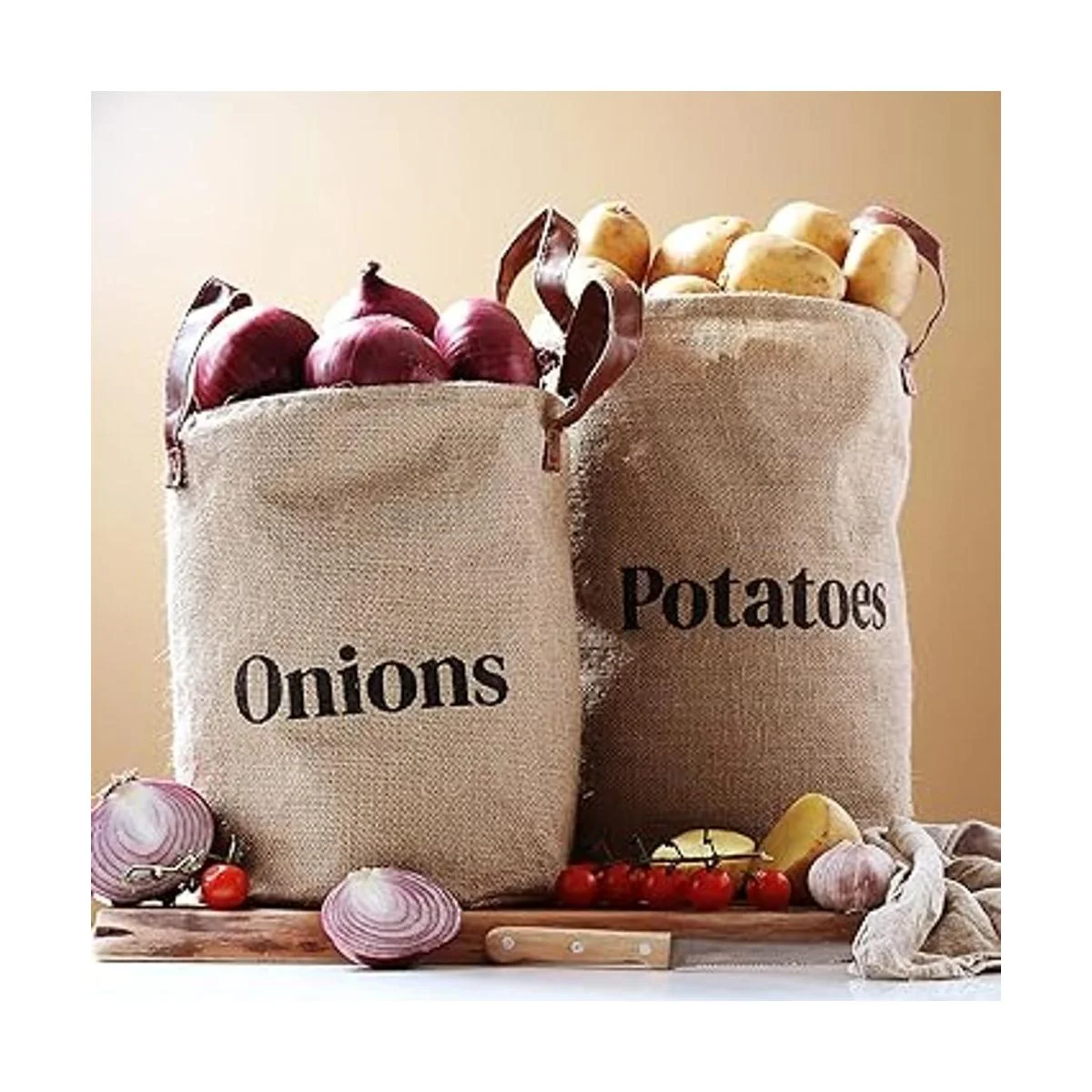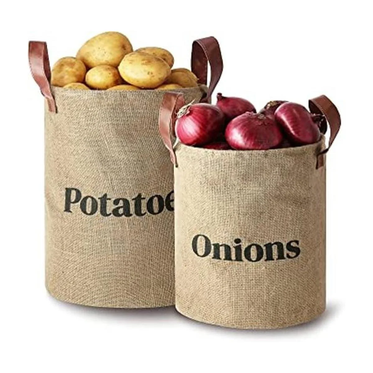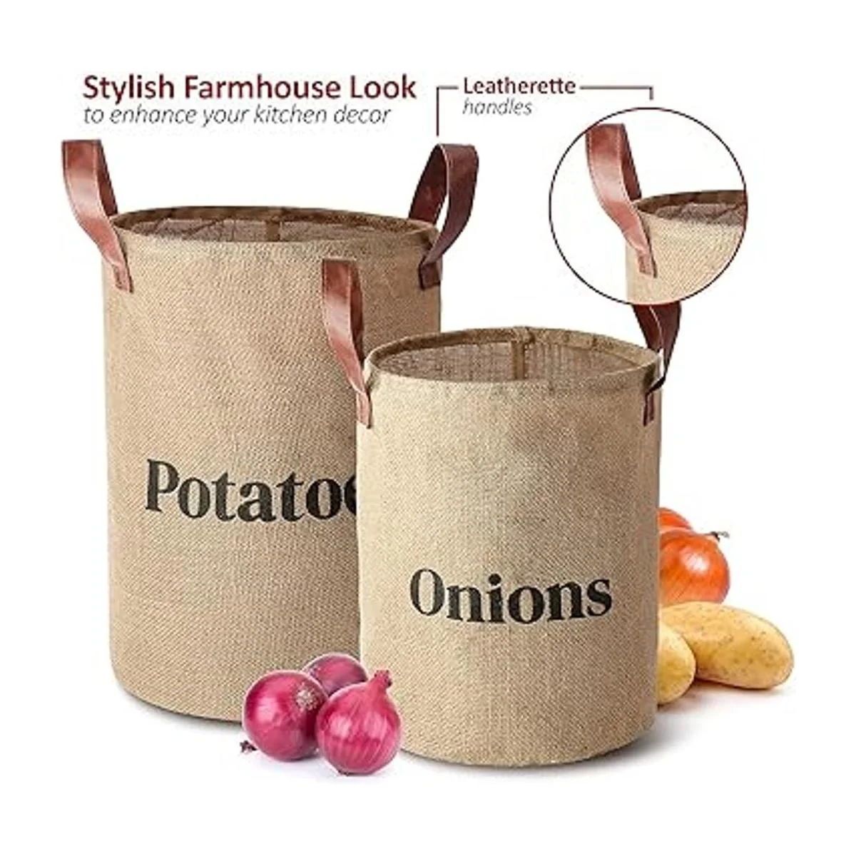 Juego de 2 cestas de almacenamiento de arpillera para papas y cebollas con asas, diseño decorativo rústico para decoración del hogar, organización de cocina, paquete de 2