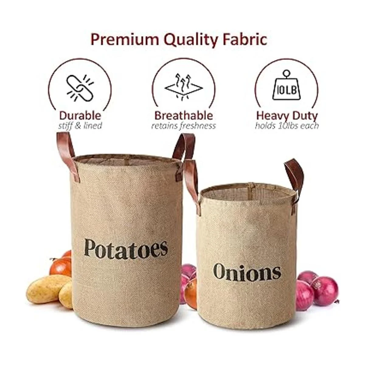 Capacidad de almacenamiento extragrande: estas resistentes bolsas de almacenamiento de verduras son muy grandes; puedes almacenar cómodamente hasta 10 libras de patatas y 5 libras de cebollas en ellas. El recipiente de patatas mide 14.5 pulgadas de altura, y tiene una apertura de 10 pulgadas de diámetro. El recipiente de cebolla mide 11.5 pulgadas de altura, y tiene una apertura de 9 pulgadas de diámetro.