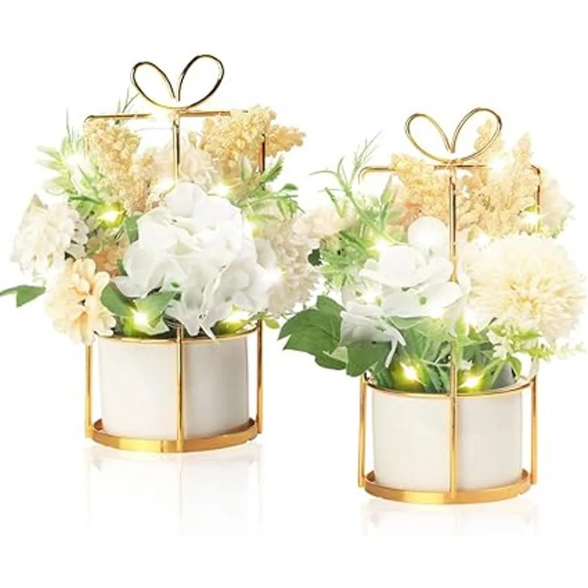 Juego de 2 flores artificiales LED en maceta, flores blancas falsas para colgar en macetas para el hogar, sala de estar, oficina, decoración de fiesta
