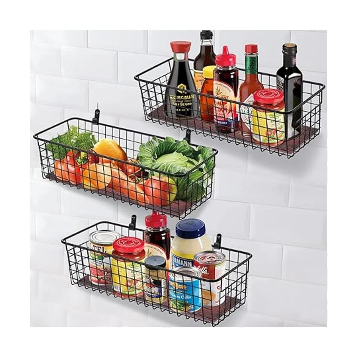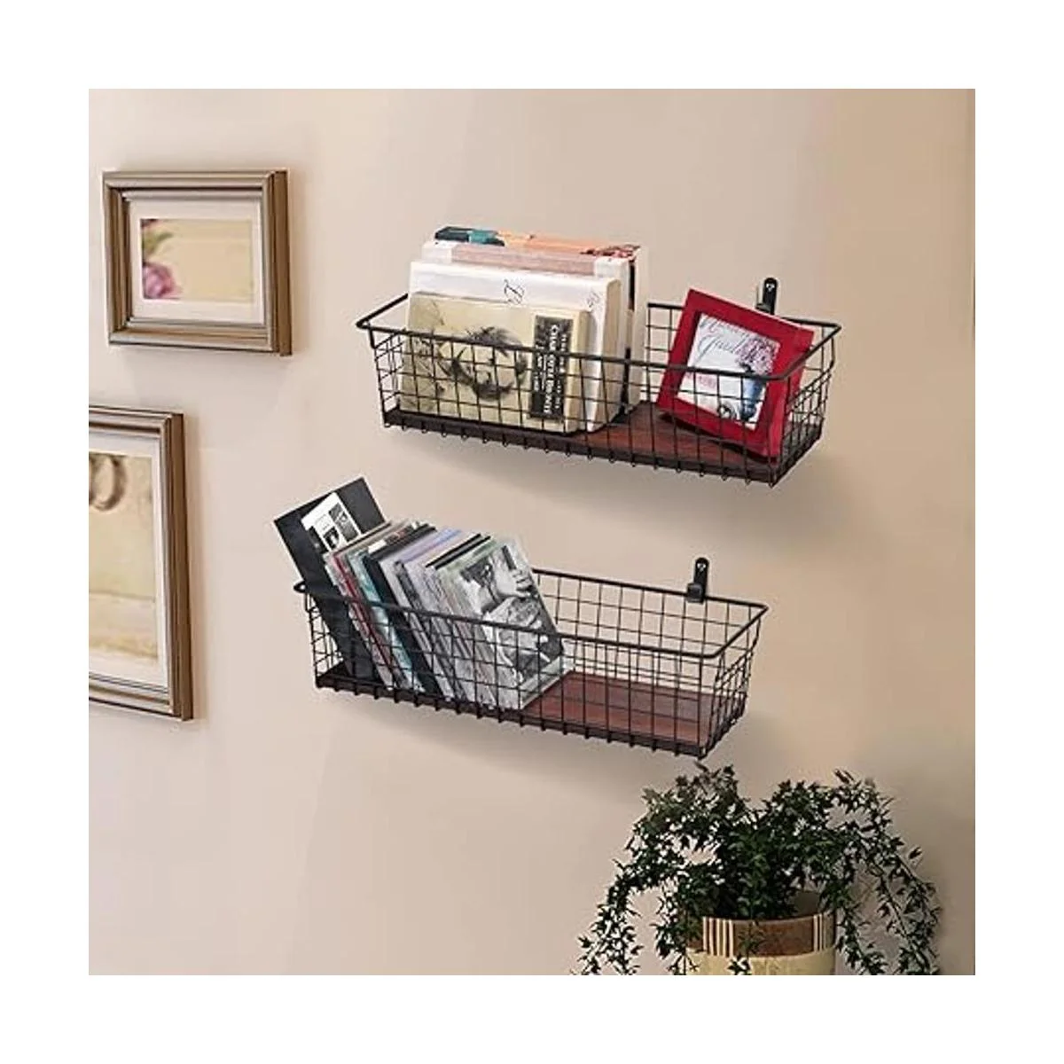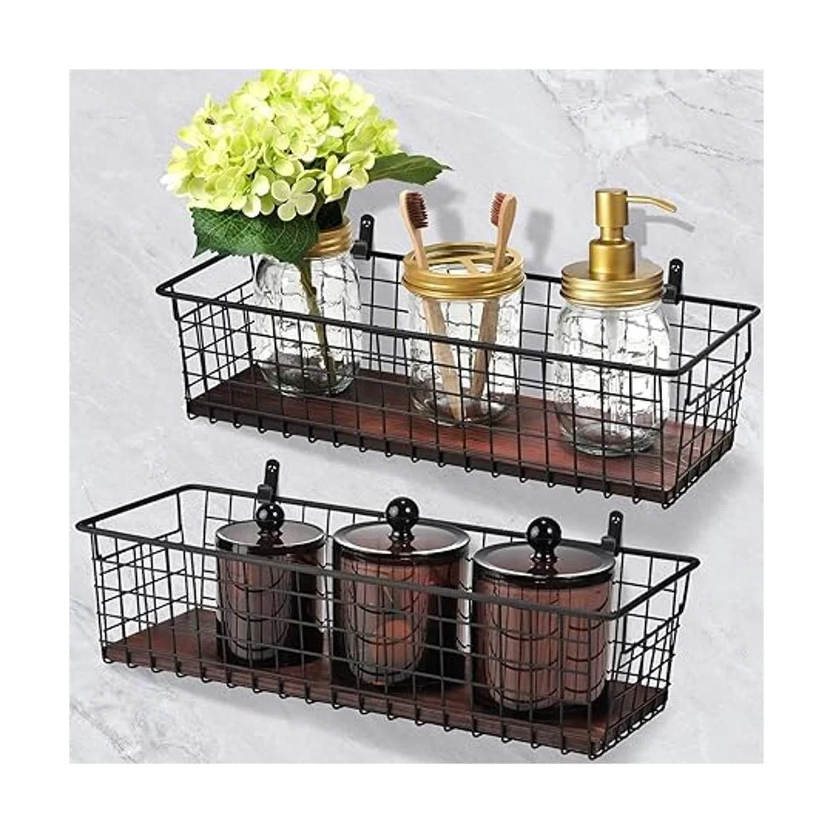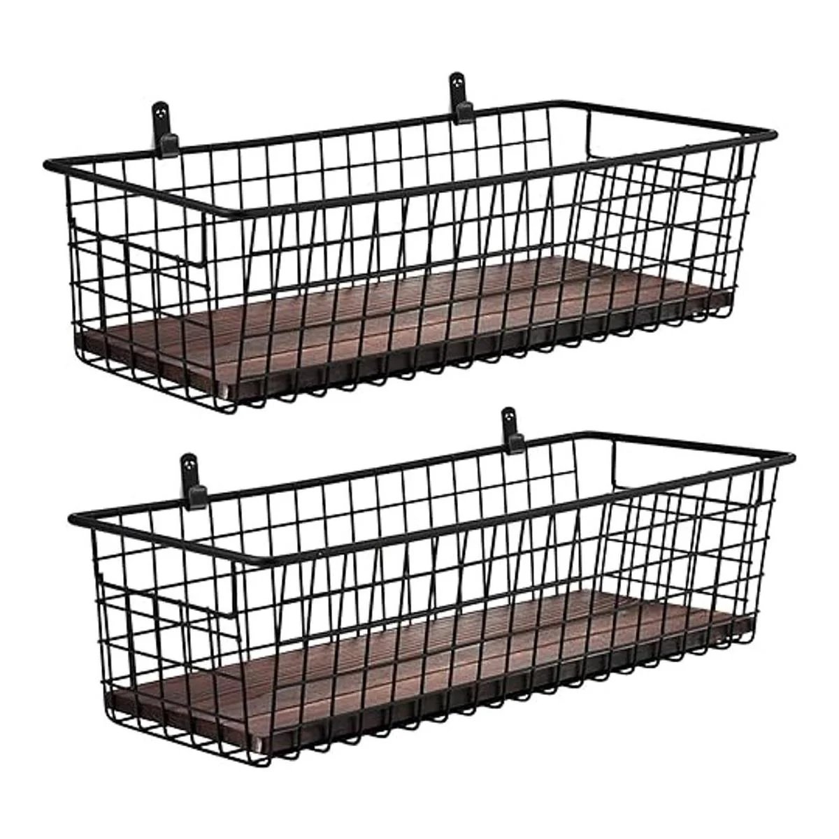 Almacenamiento sencillo: el estilo vintage y moderno de granja de este estante de alambre de metal compuesto de tablas de madera añadirá estilo a tu almacenamiento y complementará tu decoración; hermoso y funcional; gran herramienta de almacenamiento para cocina, baño, sala de estar, oficina, dormitorio, entrada, lavandería, bar, cafetería, pasillo y otros interiores. Utiliza los ganchos para montar en la pared, luego agarra las asas laterales para quitarlo y ordenar a través del contenido; aspecto rústico de granja. Juego de 2 unidades