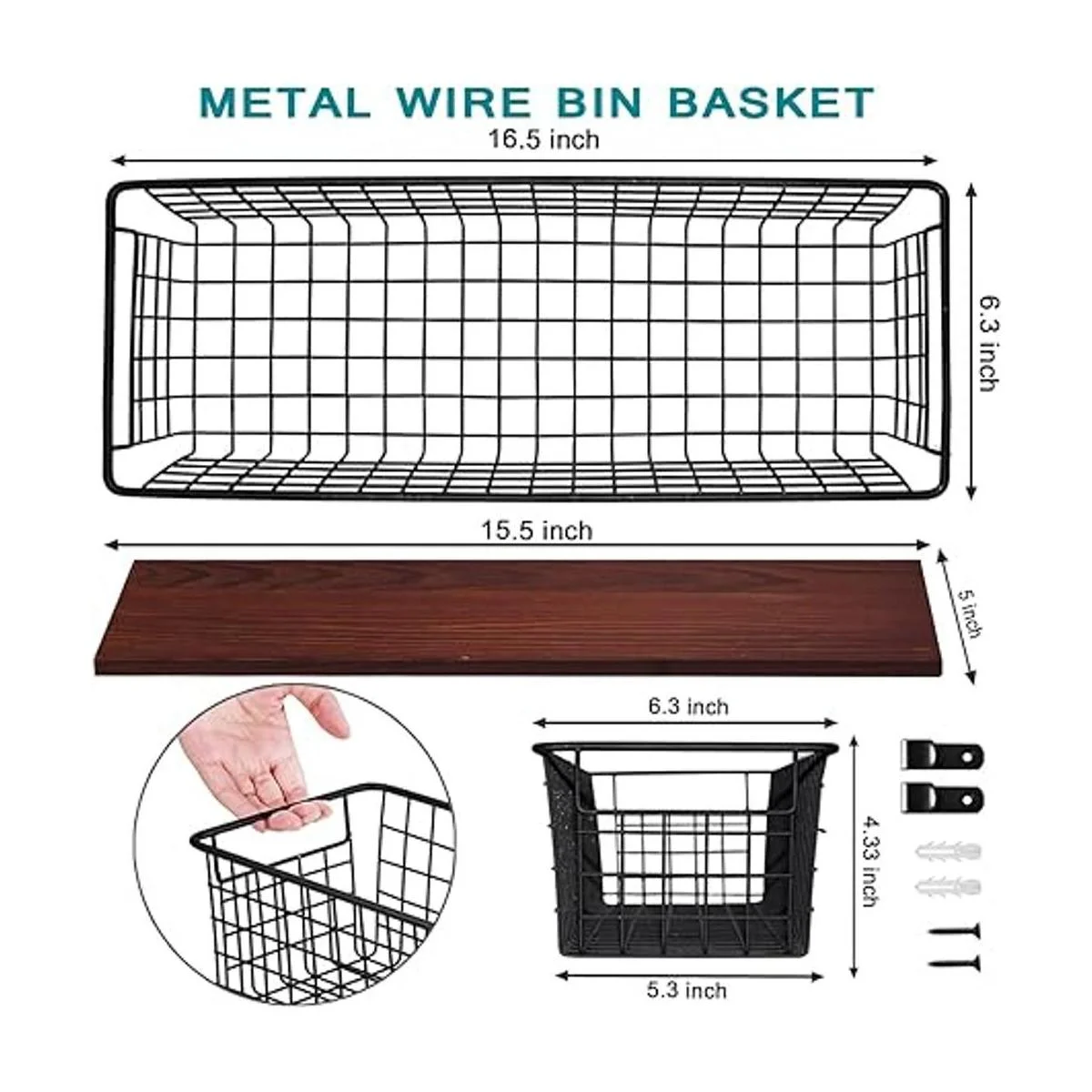 El artículo incluye: 2 cestas de alambre con madera y accesorios de montaje 4 ganchos de acero 4 tubos de expansión 4 tornillos. Cada cesta mide 16.5 x 6.3 x 4.3 pulgadas de alto. Si tienes alguna insatisfacción con nuestros productos, ponte en contacto con nosotros y te ofreceremos una solución satisfactoria en 24 horas