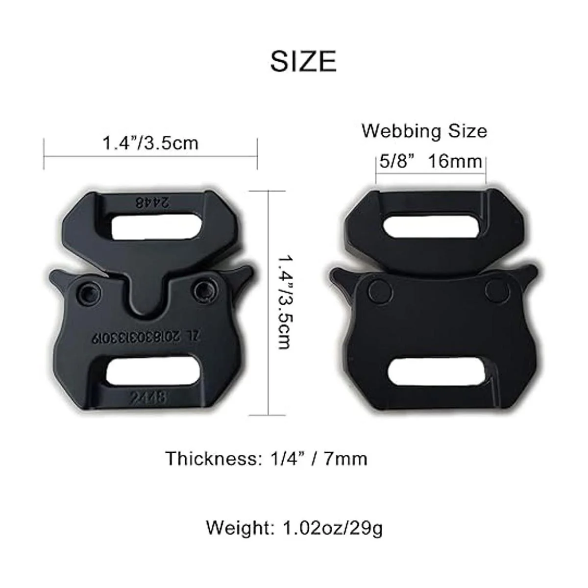 Tamaño de la cincha: 0.630 in. Longitud de la hebilla: 1.378 in, ancho: 1.378 in, grosor: 0.276 in. Peso: 1.02 oz un cierre