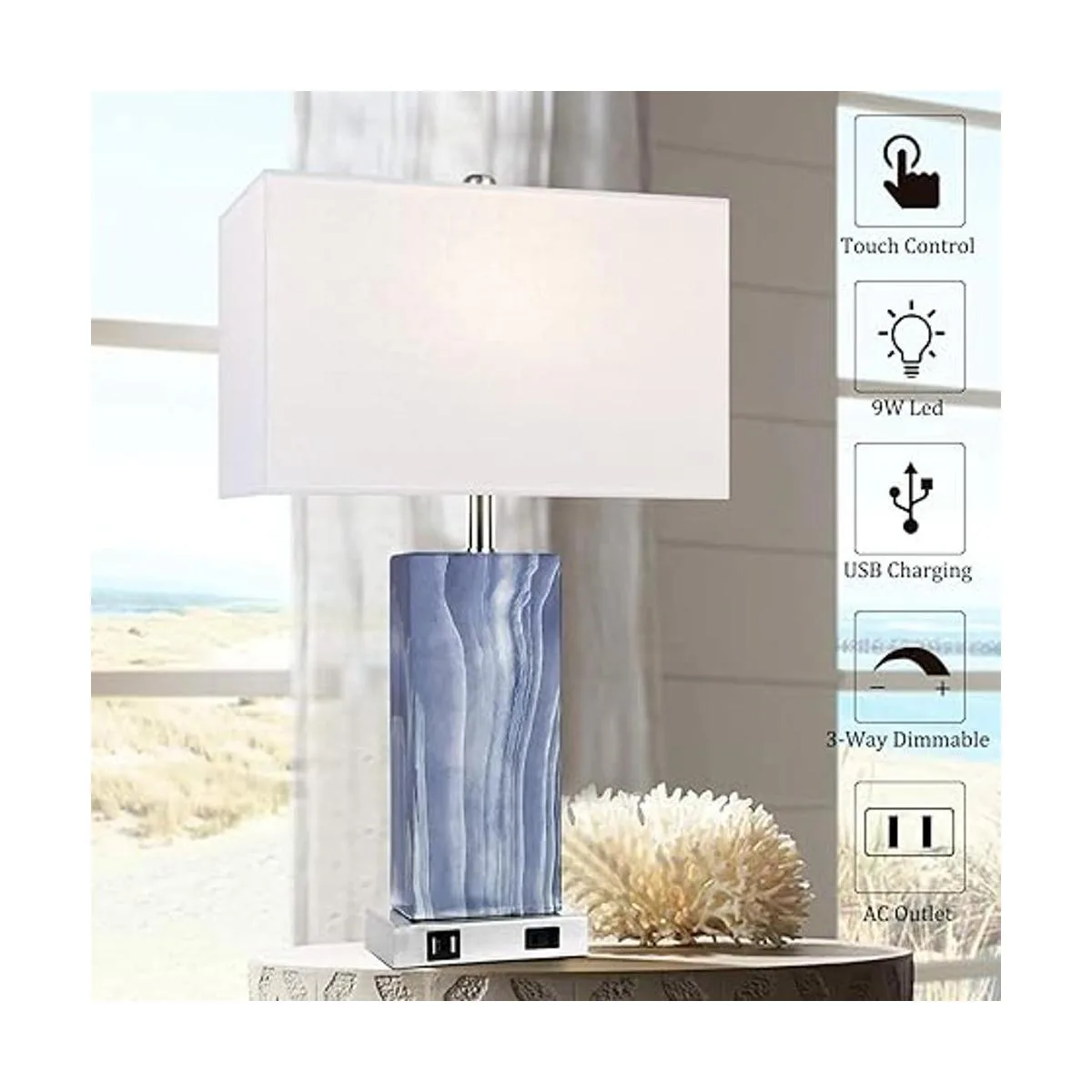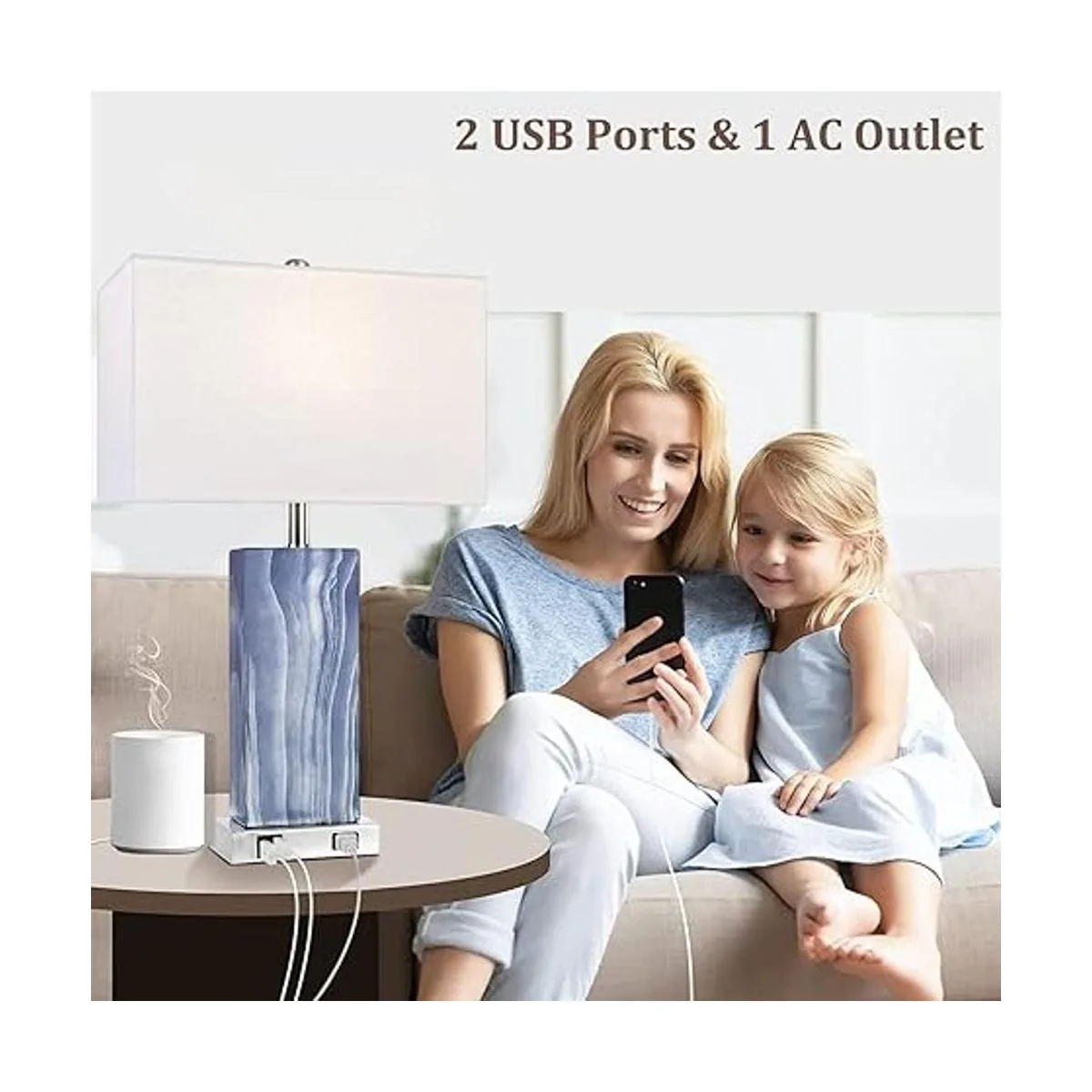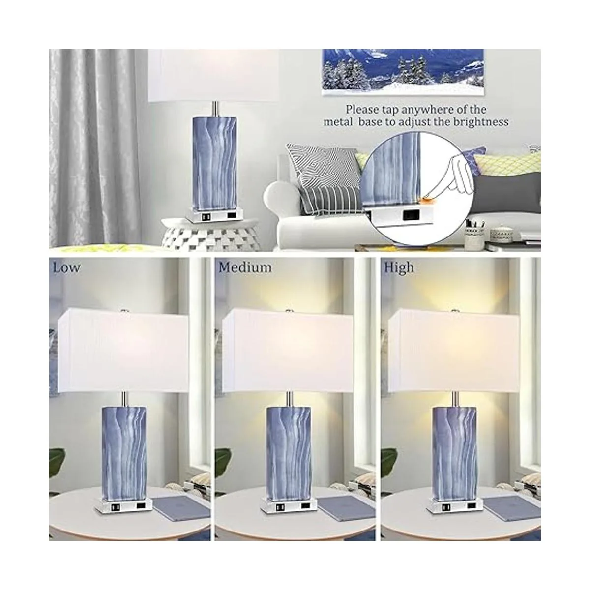 Juego de 2 lámparas de mesa con control táctil, moderna lámpara de noche de cerámica con 2 puertos USB, 1 salida de CA, lámpara de mesita de noche azul regulable de 3 vías con pantalla de tela blanca para sala de estar, dormitorio bombillas LED incluidas