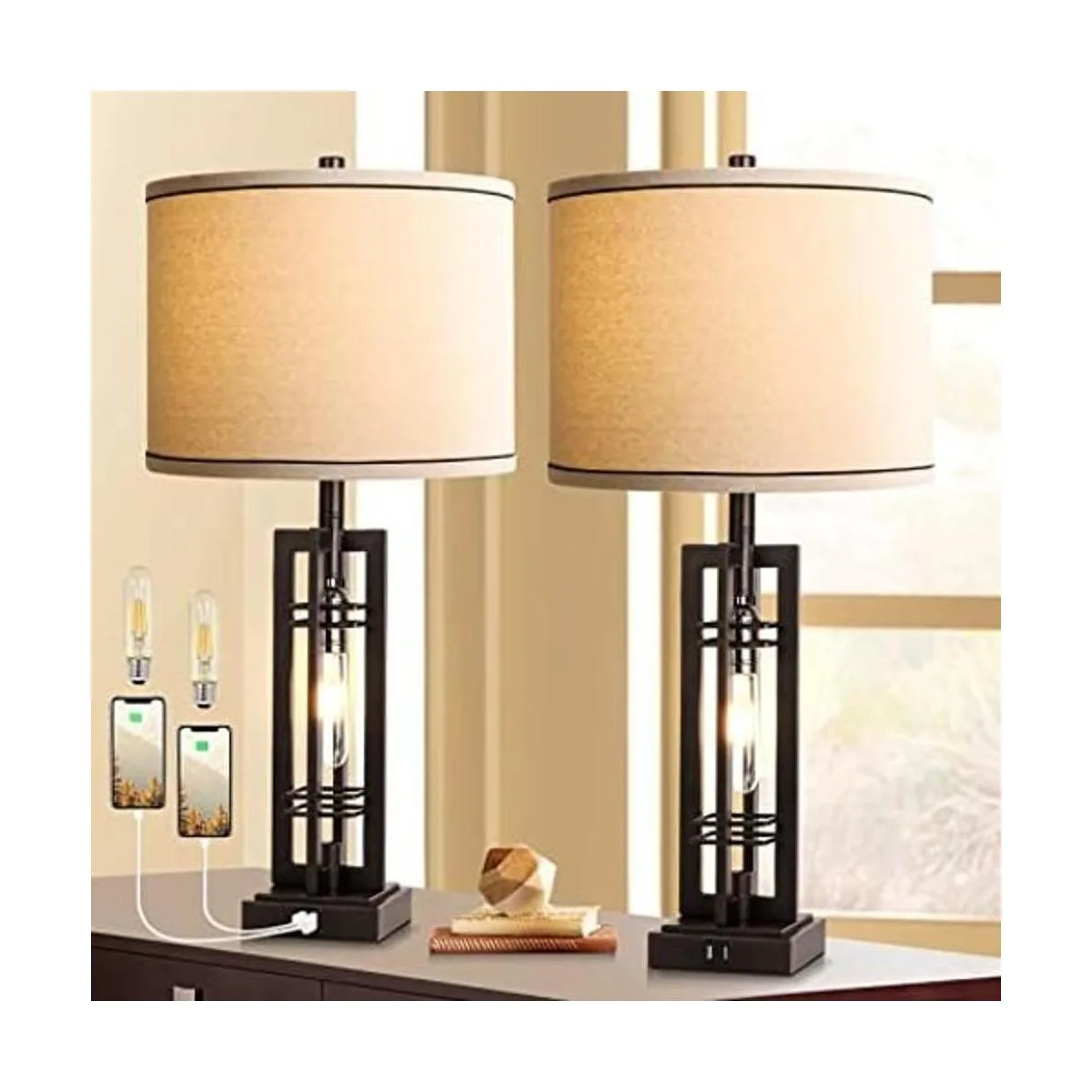 Juego de 2 lámparas de mesa con puertos USB, lámpara de mesa de granja de 27.5 pulgadas de alto con 2 focos de luz nocturna LED, lámpara de noche de bronce aceitado, sombra de avena blanca para sala de estar, dormitorio, oficina en casa