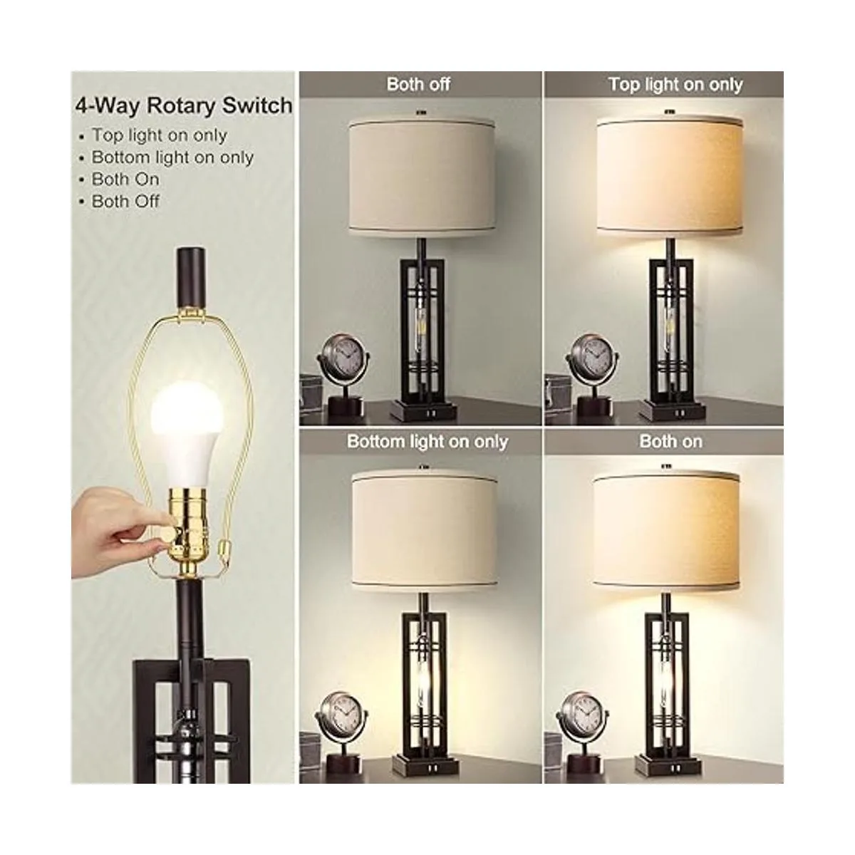 Juego de 2 lámparas de mesa de 2 luces superiores e inferiores de 27.5 pulgadas. Este juego de lámparas de mesa de granja ofrece múltiples opciones de iluminación. Recibirás dos lámparas de mesa regulares y dos luces nocturnas que están controladas por el interruptor giratorio de 4 vías para encender/apagar: luz superior encendida, luz nocturna encendida, ambos encendidos, ambos apagados, lo que te deja opciones de iluminación más que suficientes para satisfacer diferentes necesidades para alejar la oscuridad y acompañarte a la hora de acostarte, también te permite encontrar el camino fácil y seguro mientras te levantas por la noche.