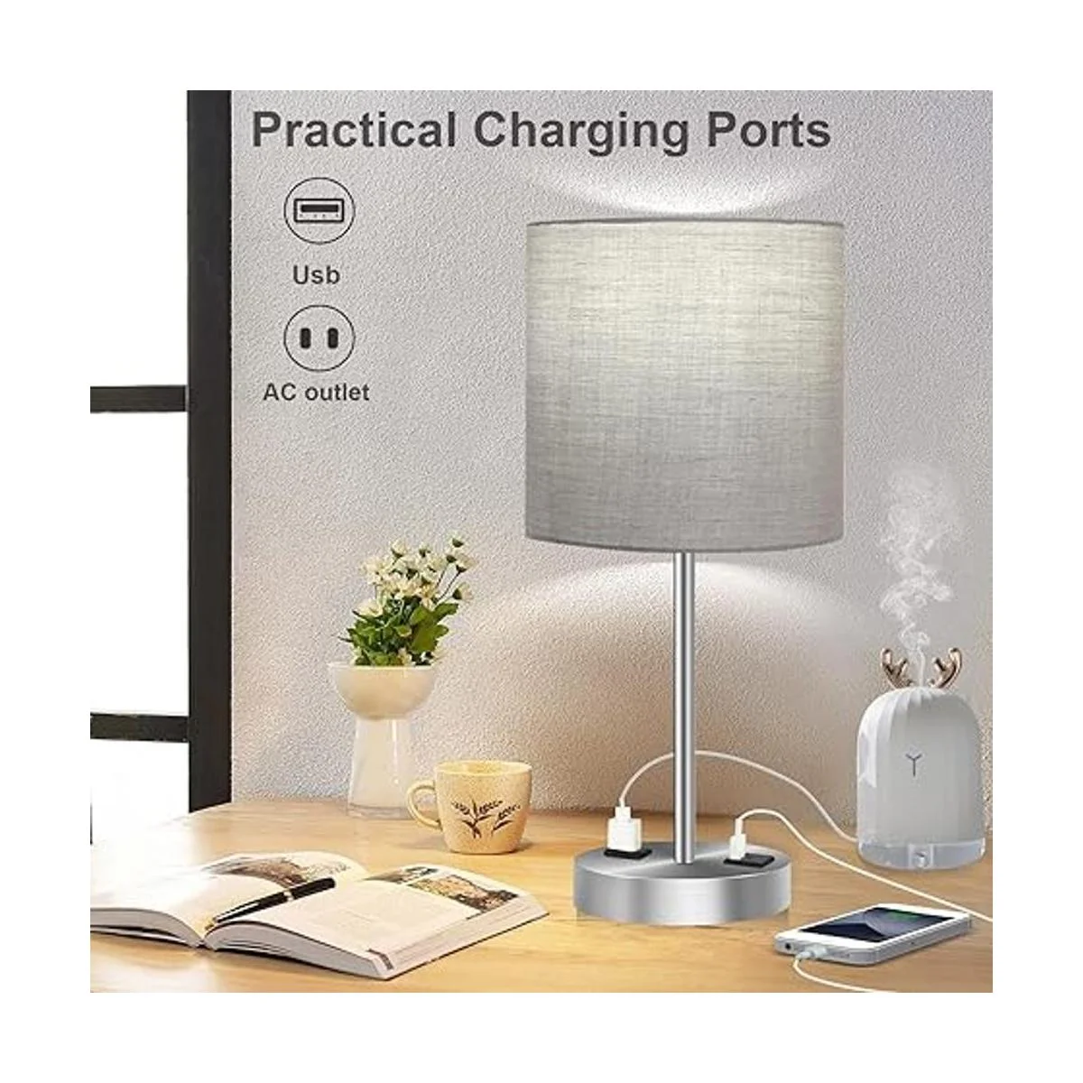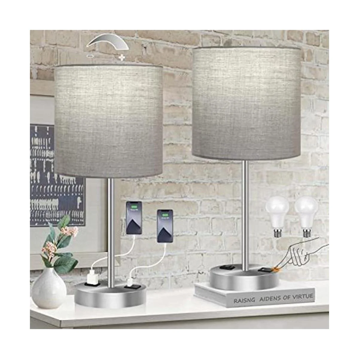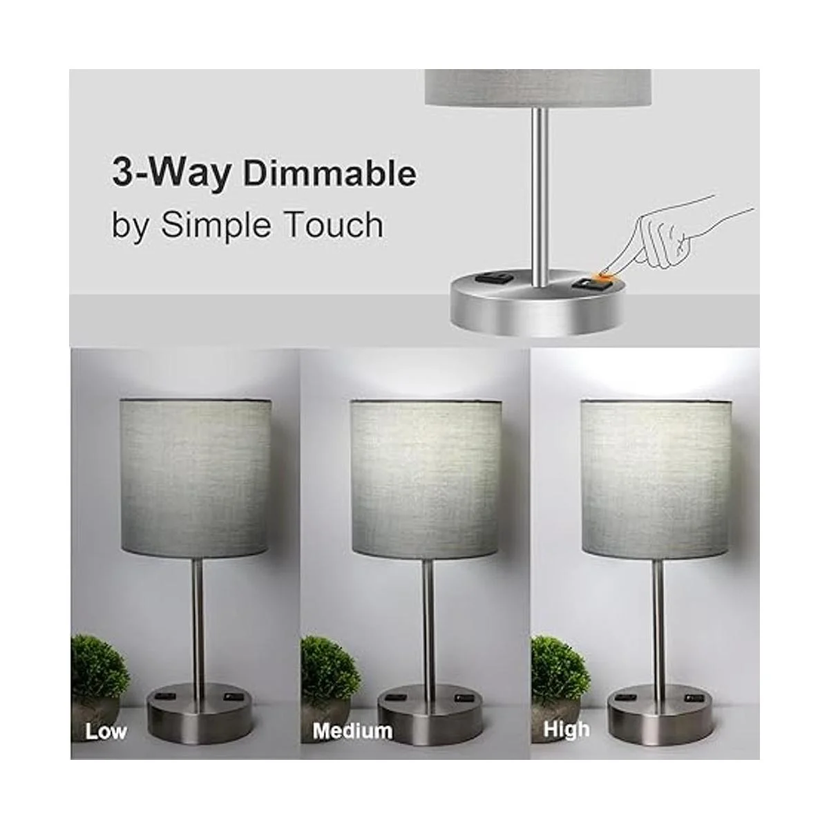 Juego de 2 lámparas de mesa para dormitorio, lámparas de noche con control táctil para mesita de noche, lámpara regulable de 3 vías con puerto USB y salida de CA, 2 bombillas blancas de luz diurna incluidas, gris