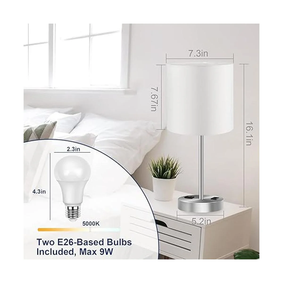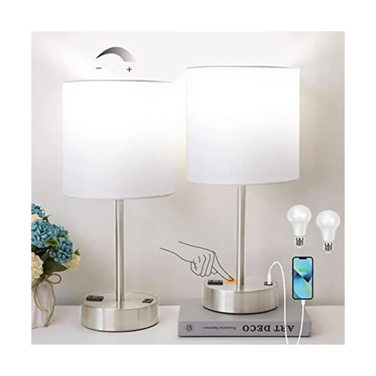 Juego de 2 lámparas de mesa táctiles para dormitorio, lámparas de mesita de noche con puerto USB y toma de corriente, lámpara blanca regulable de 3 vías para sala de estar, cuarto de bebé, bombillas blancas de luz diurna incluidas