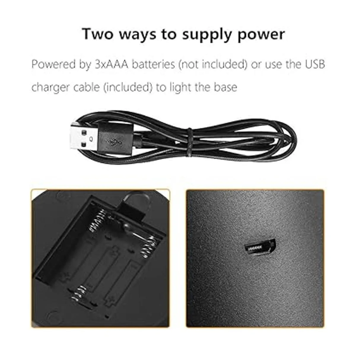 La base LED funciona con 3 pilas AAA o cable cargador USB, que se puede reemplazar fácilmente