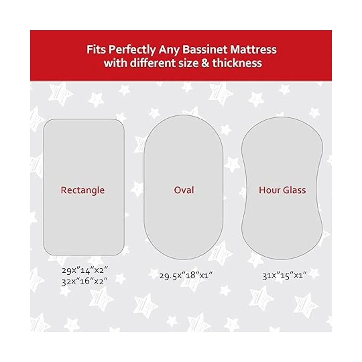 Ajuste flexible: 33 x 17 pulgadas. Nuestras sábanas de moisés se adaptan a casi todos los colchones estándar ovalados, redondos, rectangulares y con forma de reloj de arena. Cada sábana viene con una banda elástica envuelta en la parte inferior para mayor seguridad.