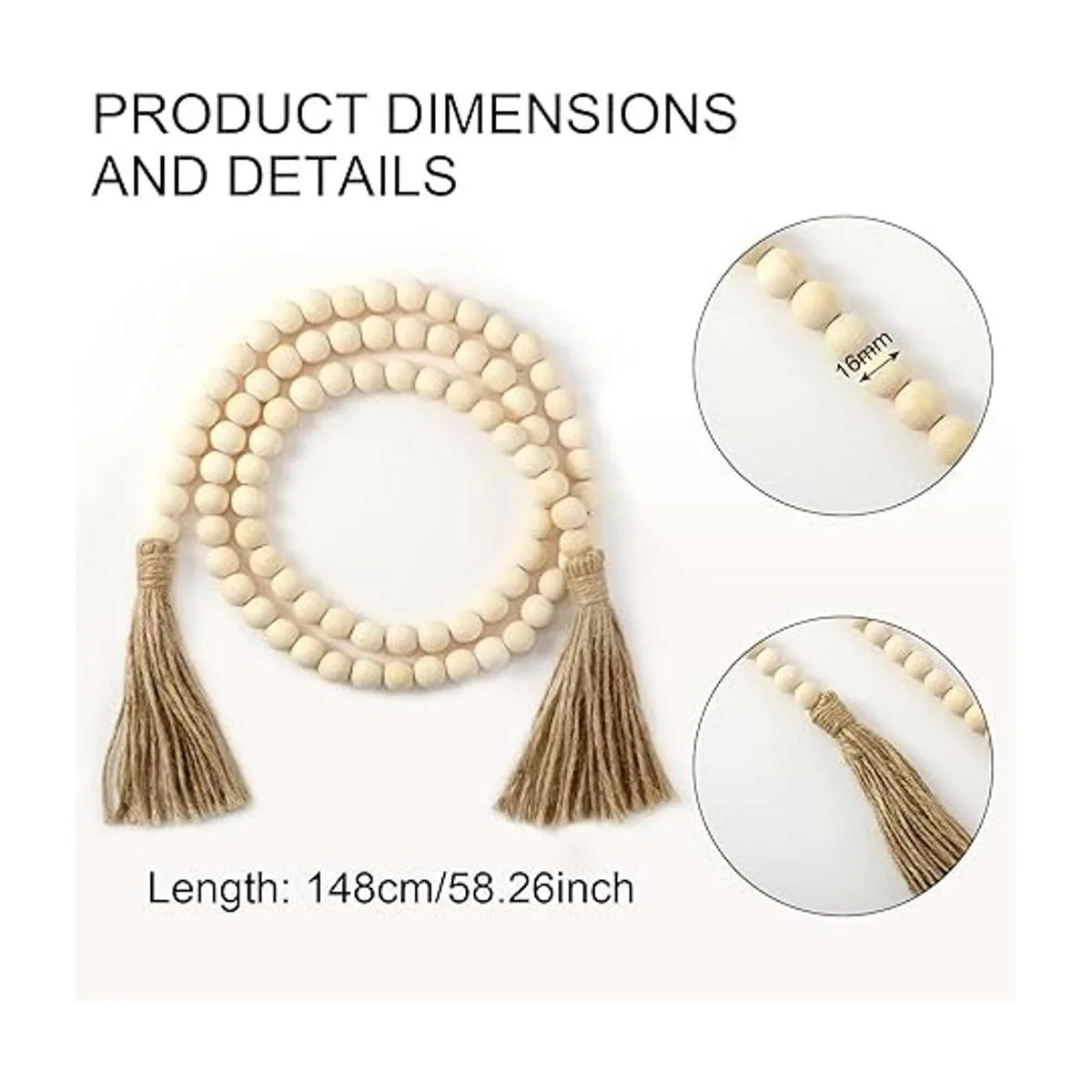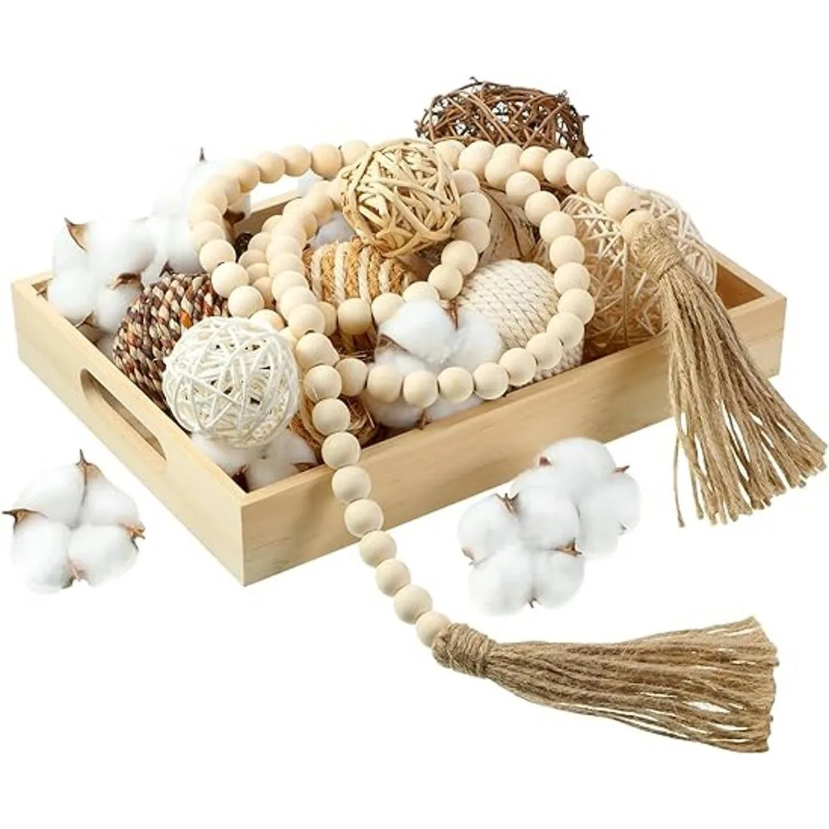 Juego de 20 bolas decorativas para cuencos, juego de bolas decorativas surtidas, relleno decorativo y guirnalda de cuentas de madera de 58 pulgadas con borlas para decoración de mesa de jarrón