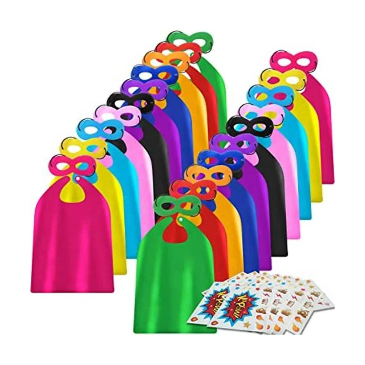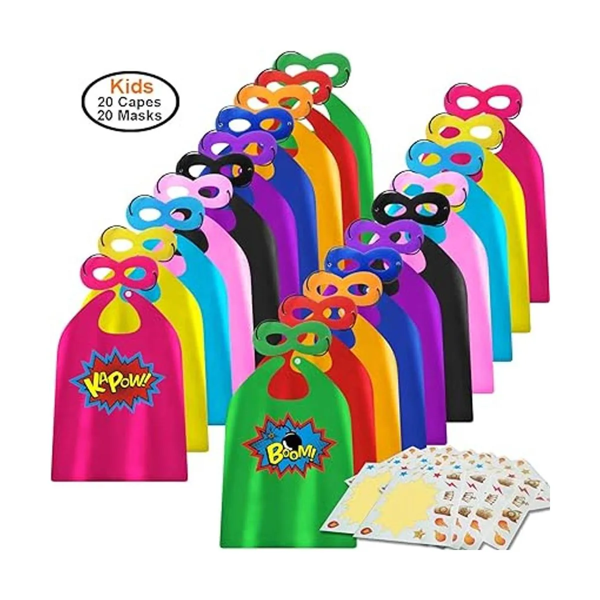 Recibirás: para 20 jugadores 20 capas para niños, 20 máscaras, 20 juegos de calcomanías de superhéroes