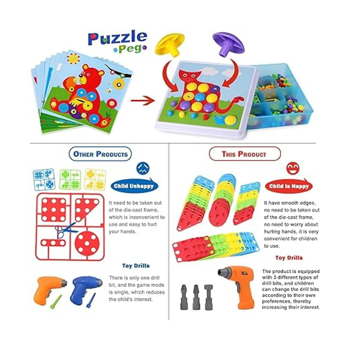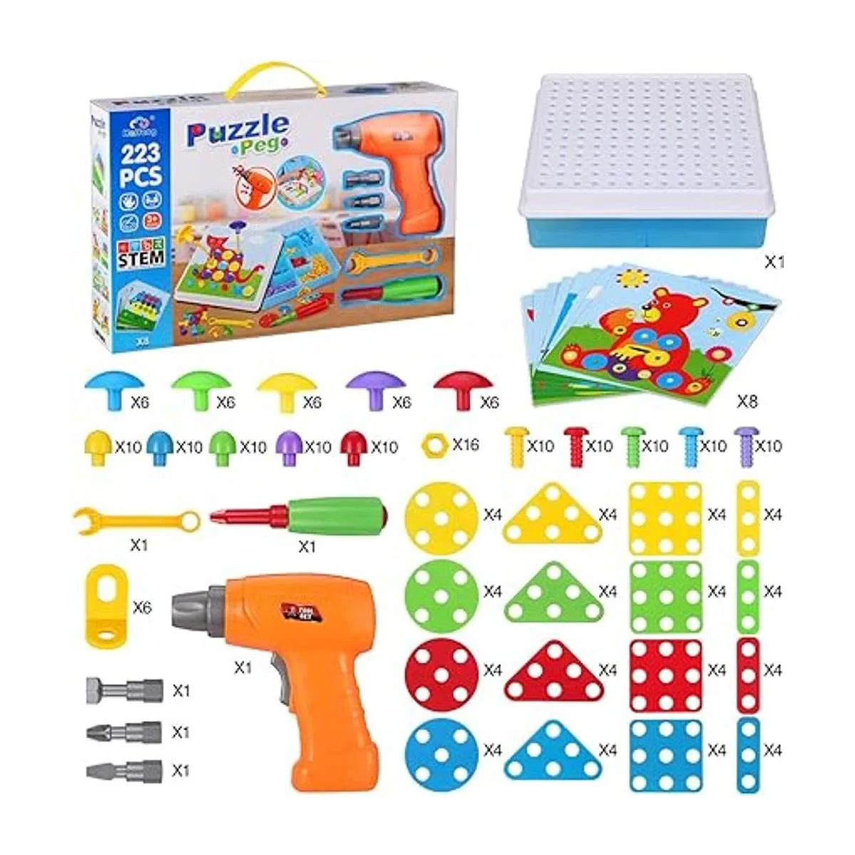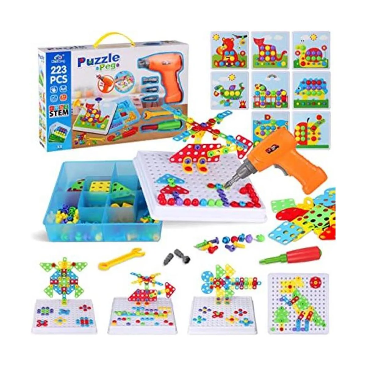 Juego de 223 piezas de taladro de mosaico creativo para niños, kit de rompecabezas de taladro de juguete y destornillador, ingeniería STEM, juguetes de bloques de construcción, centro de actividades de juego para niños de 3 a 10 años