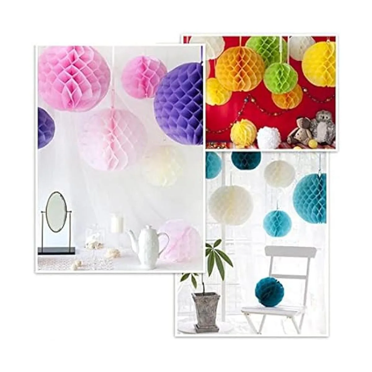 Cantidad suficiente: 8 bolas de panal, 8 pompones de papel, 8 abanicos de papel, y obtendrás 10 cintas de satén adicionales.