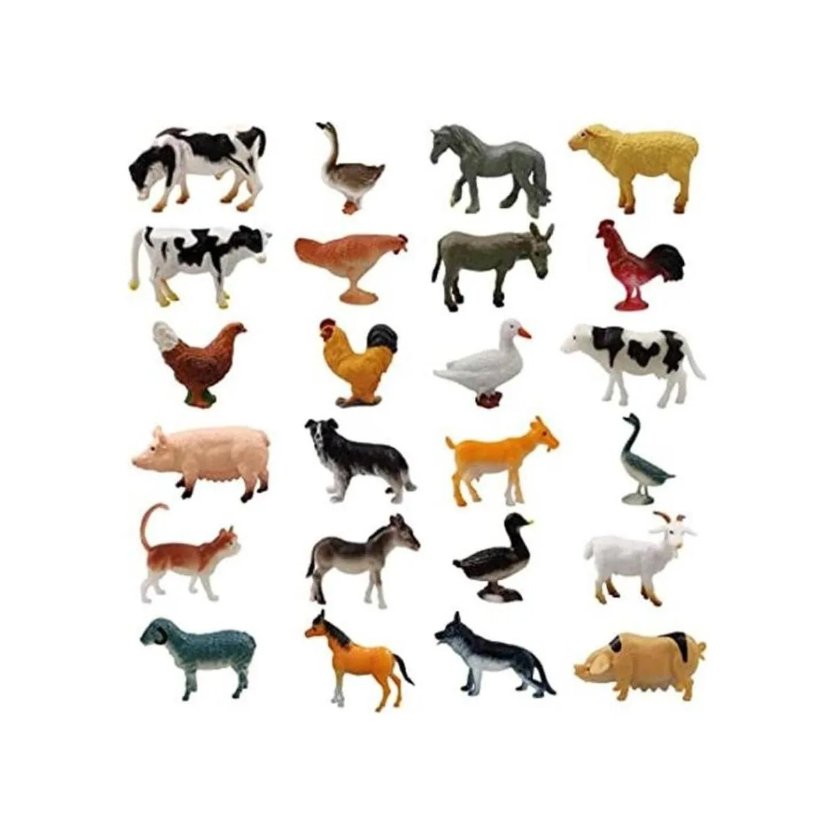 Paquete: hay 24 figuras de animales de granja de diferentes formas que incluyen burro, oveja, pollo, caballo, cabra, vaca, ganso, pato, gallina, cerdo, gato y perro.