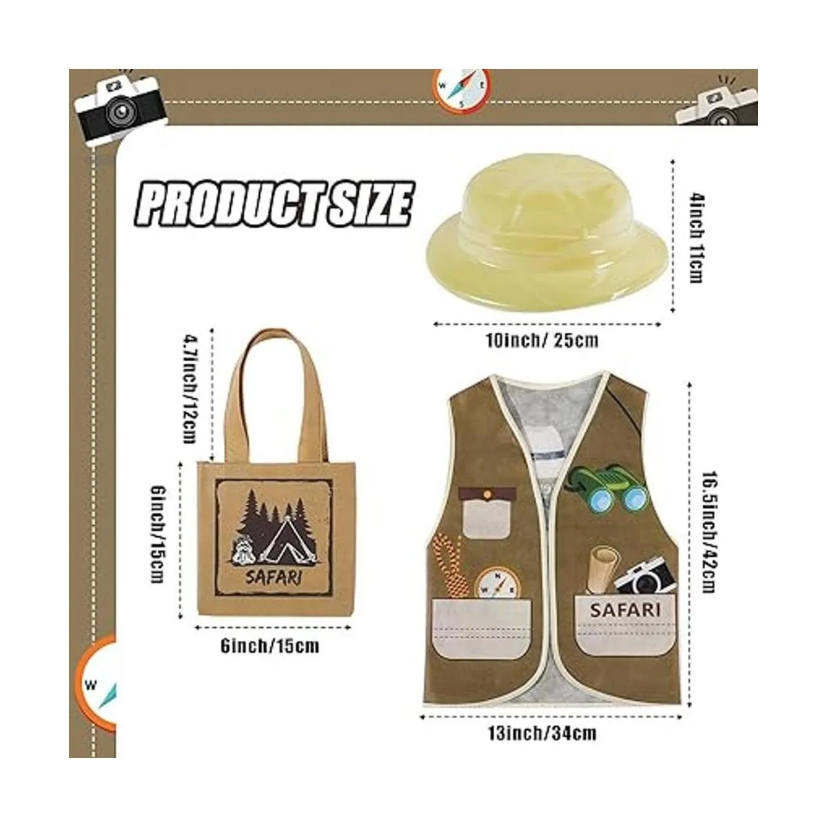 Bonito juego de vestir: el chaleco caqui, el sombrero beige y la bolsa caqui son el símbolo del safari; realista y adorable, los disfraces de explorador son la decoración esencial de fiesta temática para tu pequeño, lo que creará una fiesta inolvidable para ellos