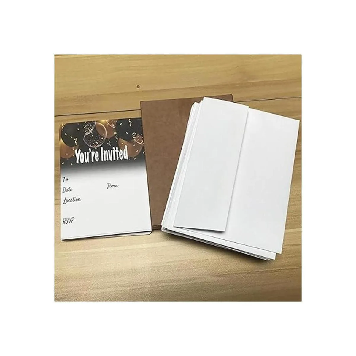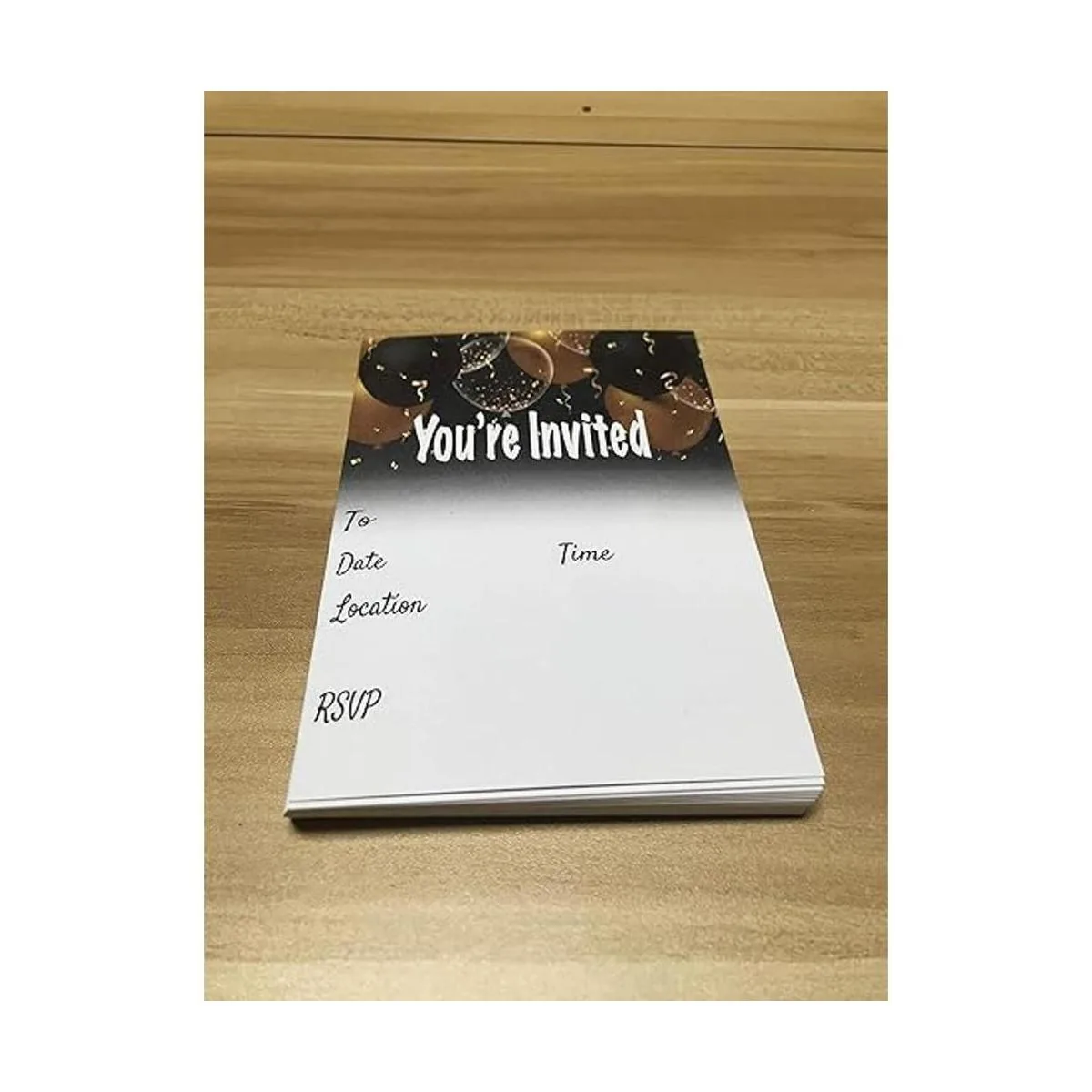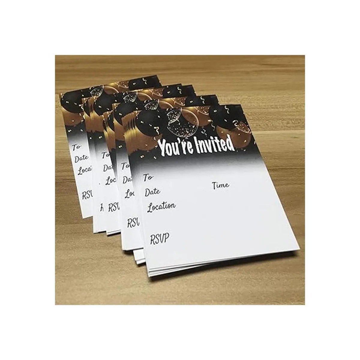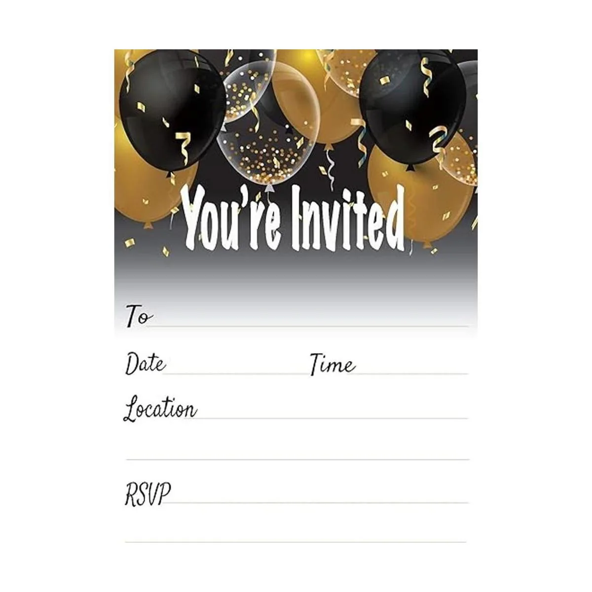 Juego de 25 invitaciones de globos negros y dorados con sobres. Invita para aniversarios, cumpleaños, dulces 16, despedidas de soltera, baby showers, hitos de cumpleaños y más.