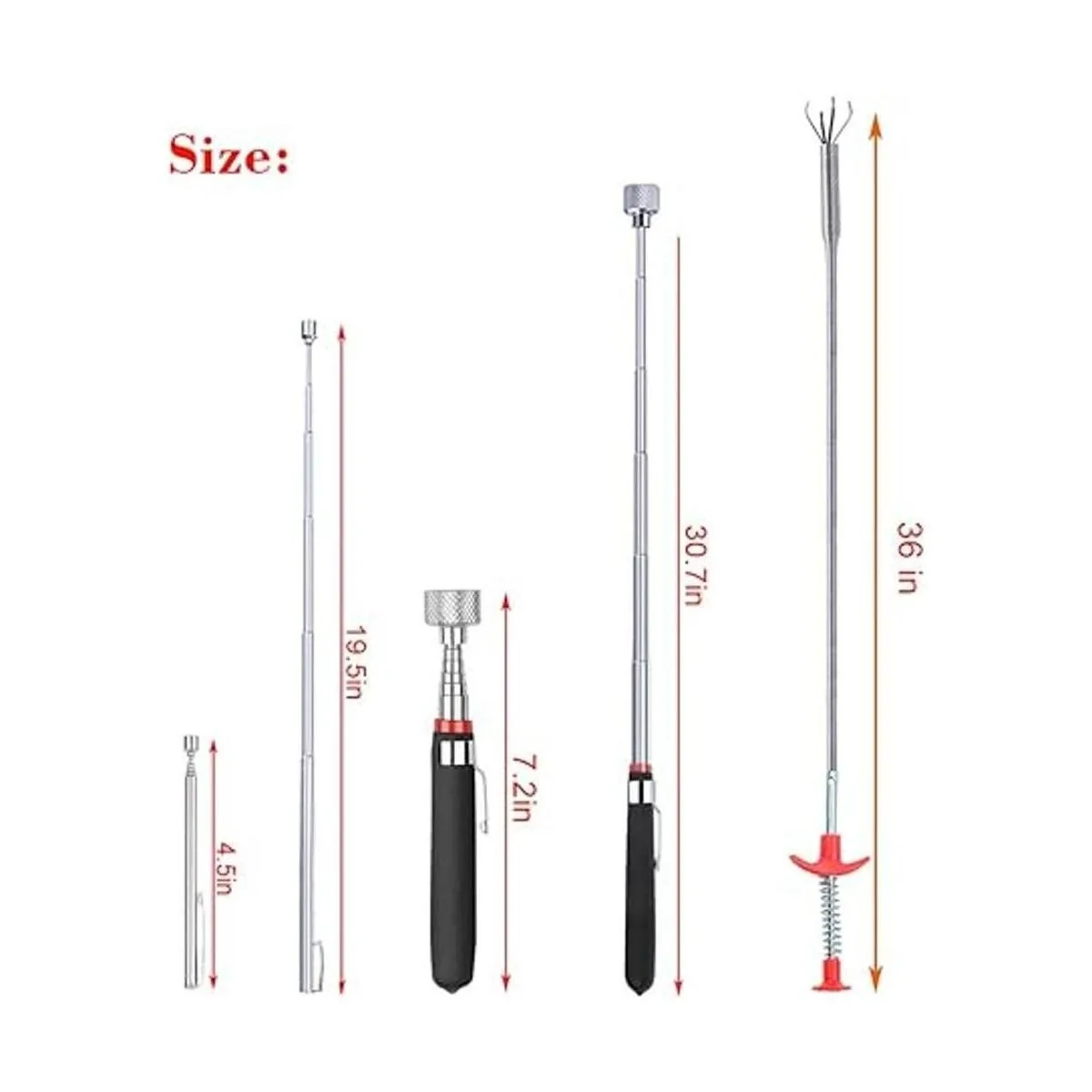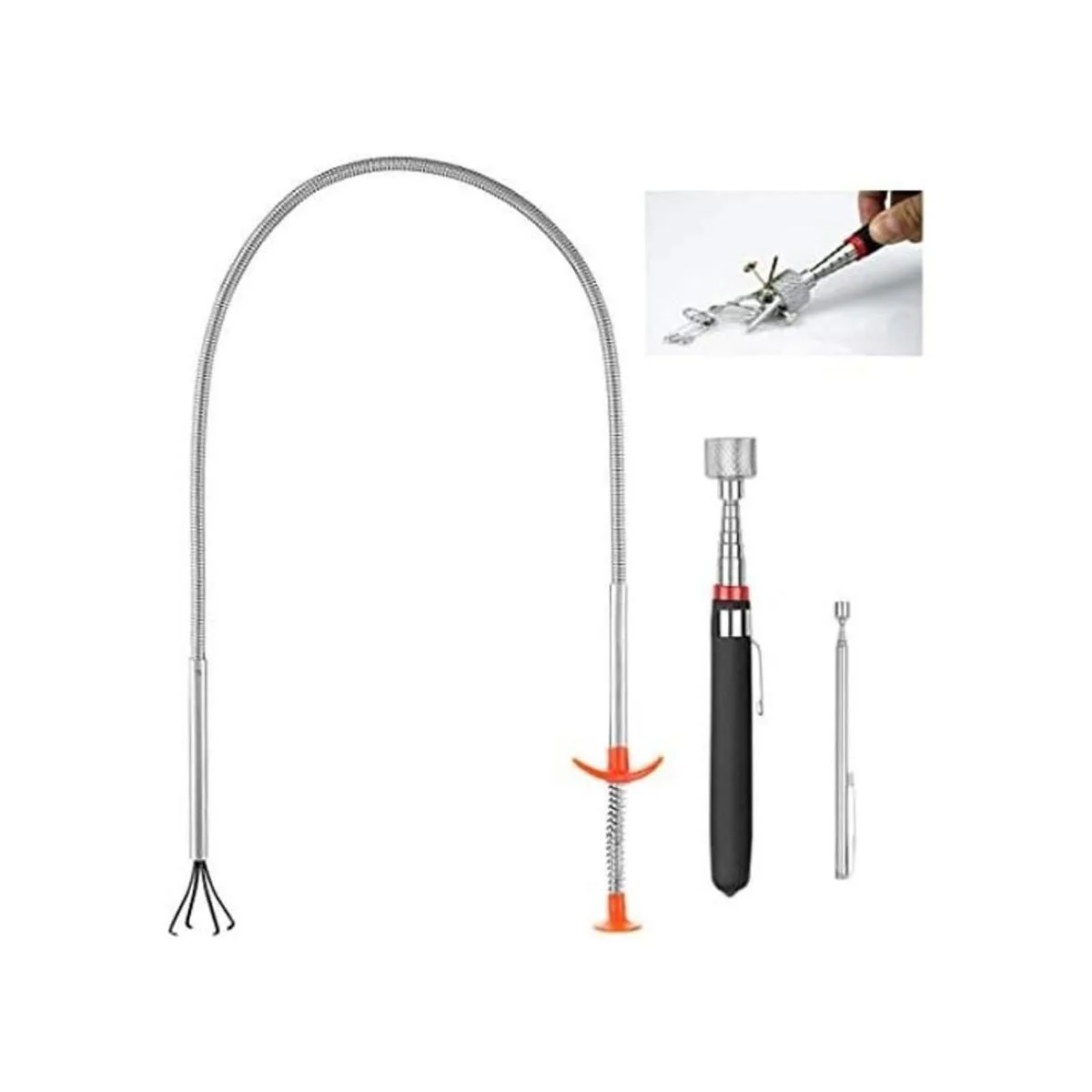 Paquete de 3 juegos Kit de herramientas telescópicas magnéticas de 2 piezas: la longitud de la herramienta de púa que se puede estirar es la siguiente. 15 lb 7.231inch /1 lb 4.519.5inch. Y 1 pinza flexible de 36.0 in.