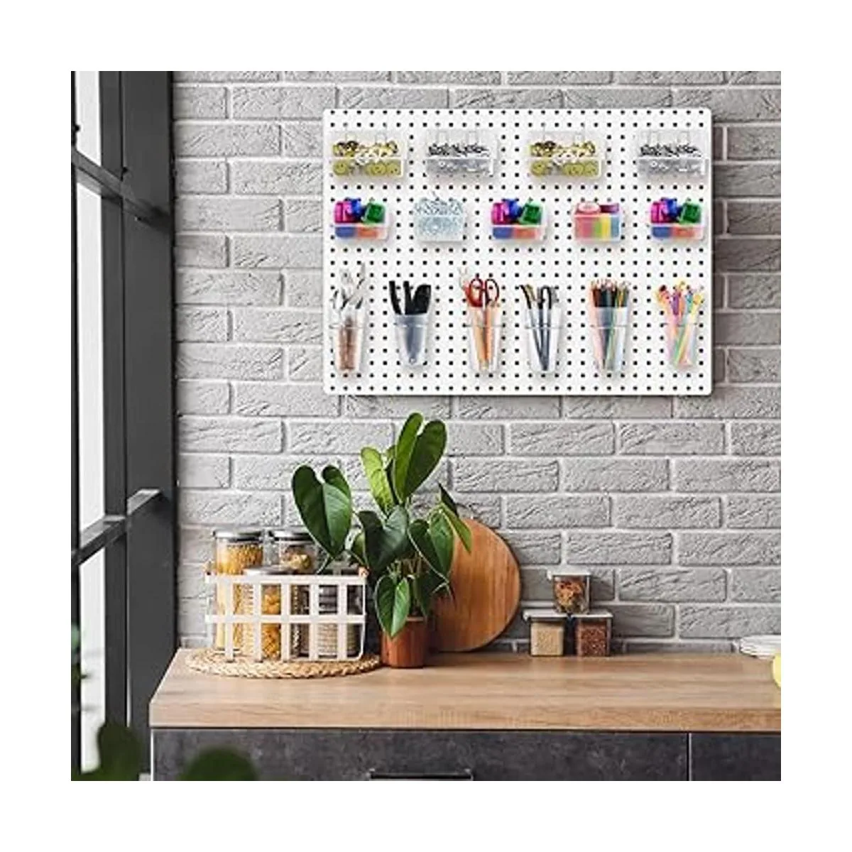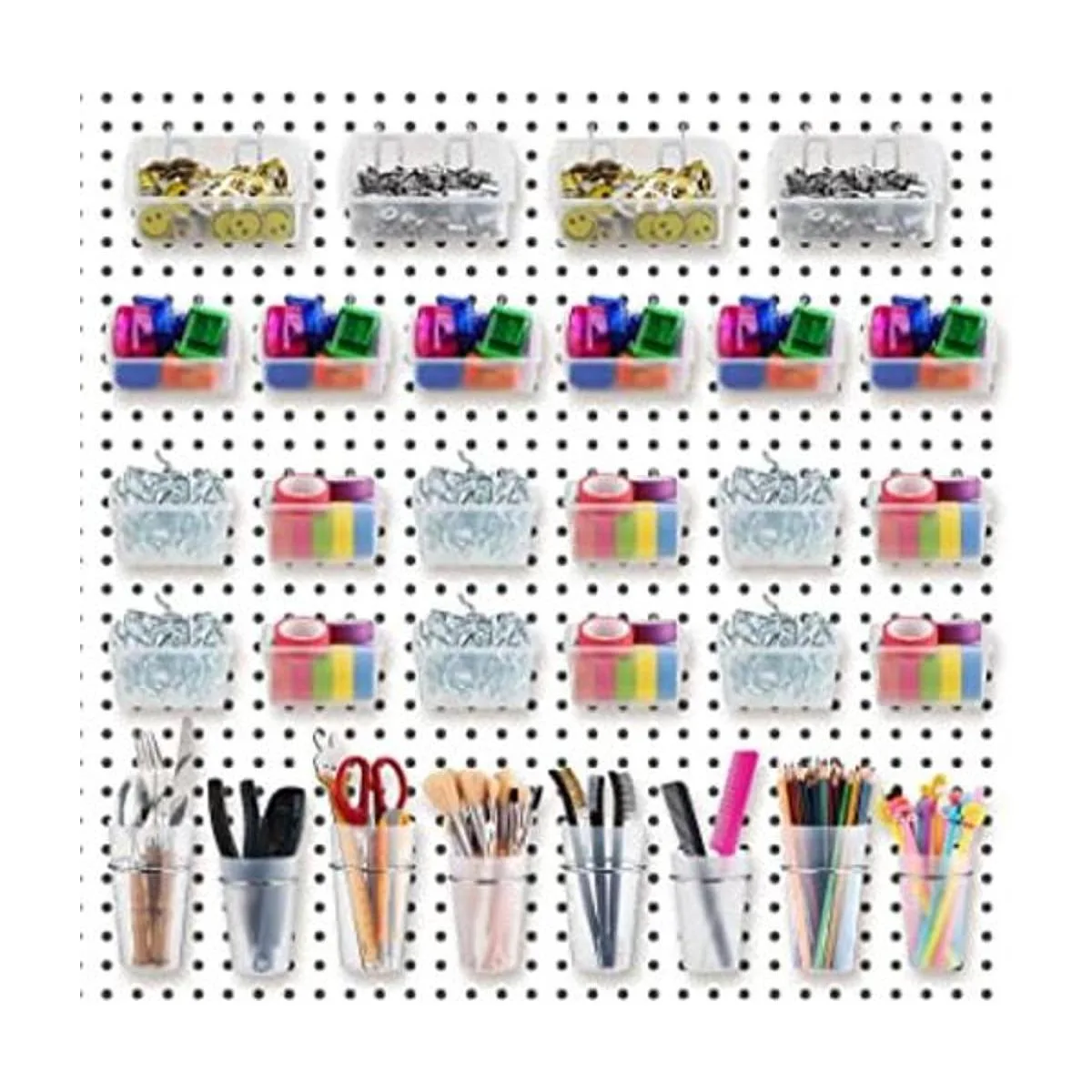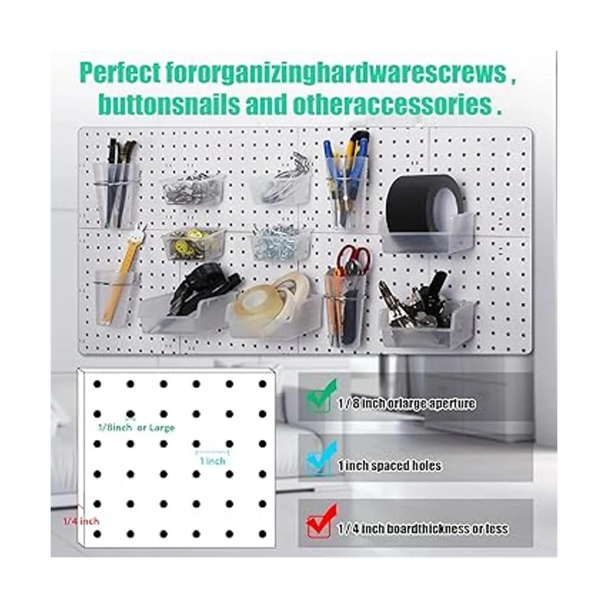 Fácil de usar e instalar: el organizador de tablero de clavijas está equipado con ganchos de metal, que son más estables bloqueados en los agujeros del tablero de clavijas y tus artículos no se caen fácilmente, lo que te ofrece una bonita conveniencia; además, el kit de tablero organizador de tablero de clavijas viene en tamaño universal y se adapta a tableros de clavijas de 1/8 pulgadas y 1/4 pulgadas con espacio de 1 pulgada, que es fácil de usar e instalar sin acceder a su parte posterior